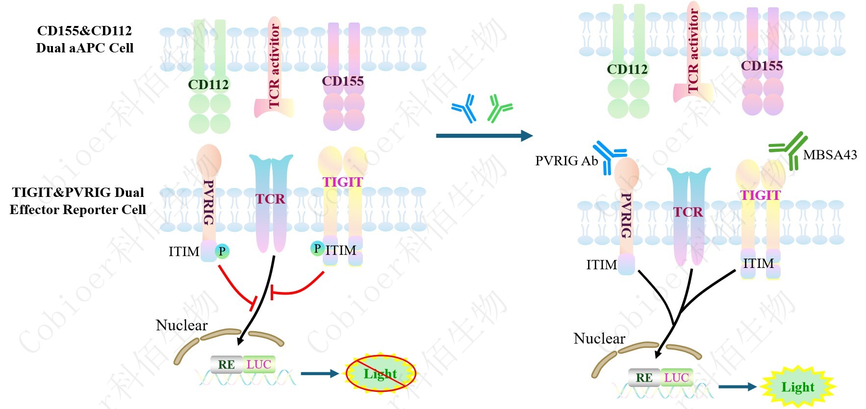 CD155&CD112 Dual aAPC Cell 作為 TIGIT&PVRIG Dual Effector Reporter Cell 的靶細 胞,很好的模擬了體內 TIGIT&PVRIG 的信號轉導過(guò)程,原理見(jiàn)下圖所示。