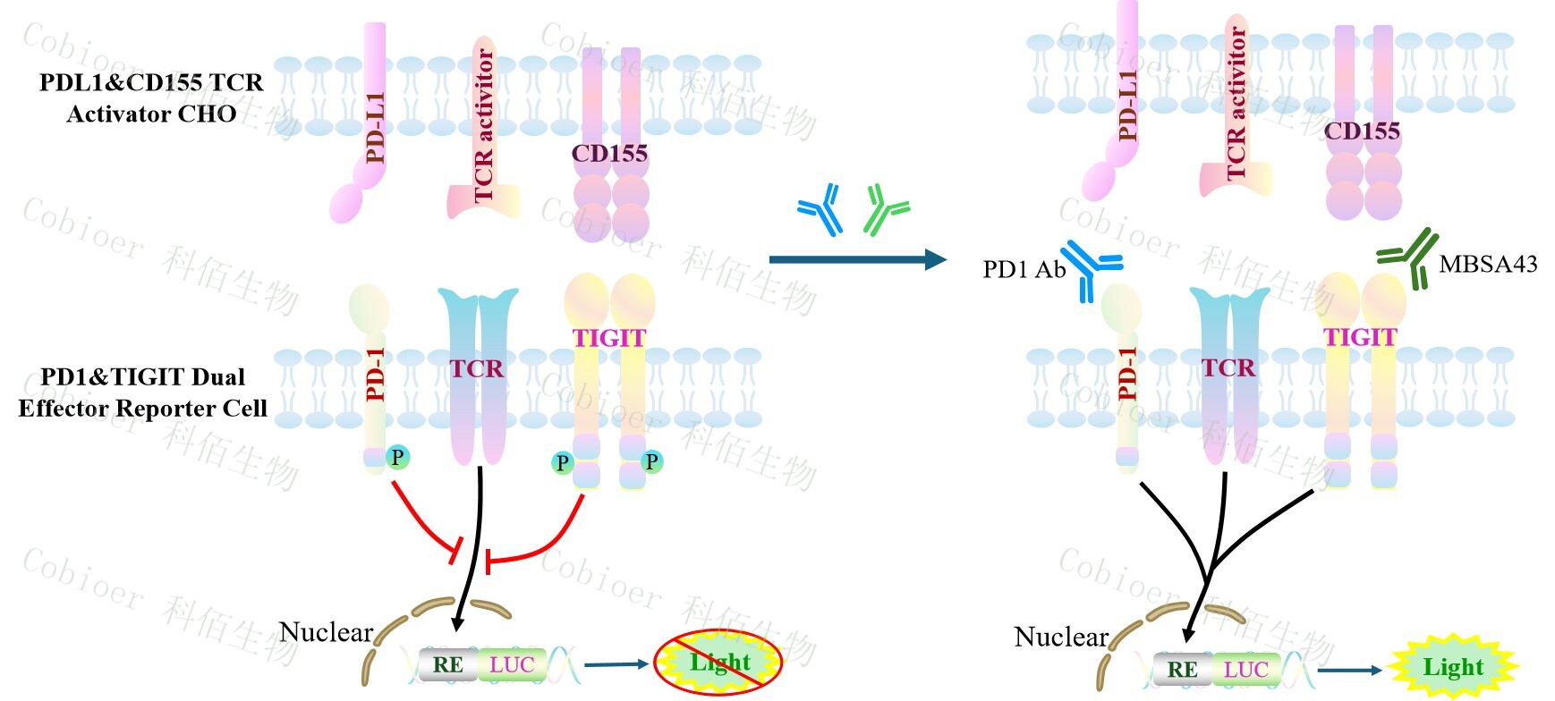 PDL1&CD155 TCR Activator CHO 作為 PD1&TIGIT Dual Effector Reporter Cell 的靶細 胞,很好的模擬了體內 PD1&TIGIT 的信號轉導過(guò)程,原理見(jiàn)下圖所示。