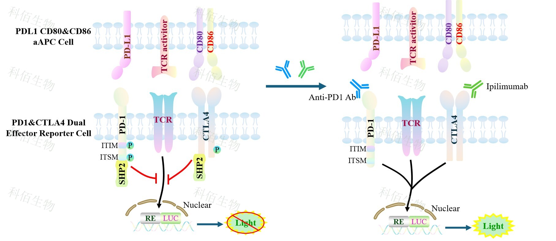 PDL1 CD80&CD86 aAPC Cell 作為 PD1&CTLA4 Dual Effector Reporter Cell 的靶細胞,很好的模擬了體內 PD1&CTLA4 的信號轉導過(guò)程,原理見(jiàn)下圖所示。