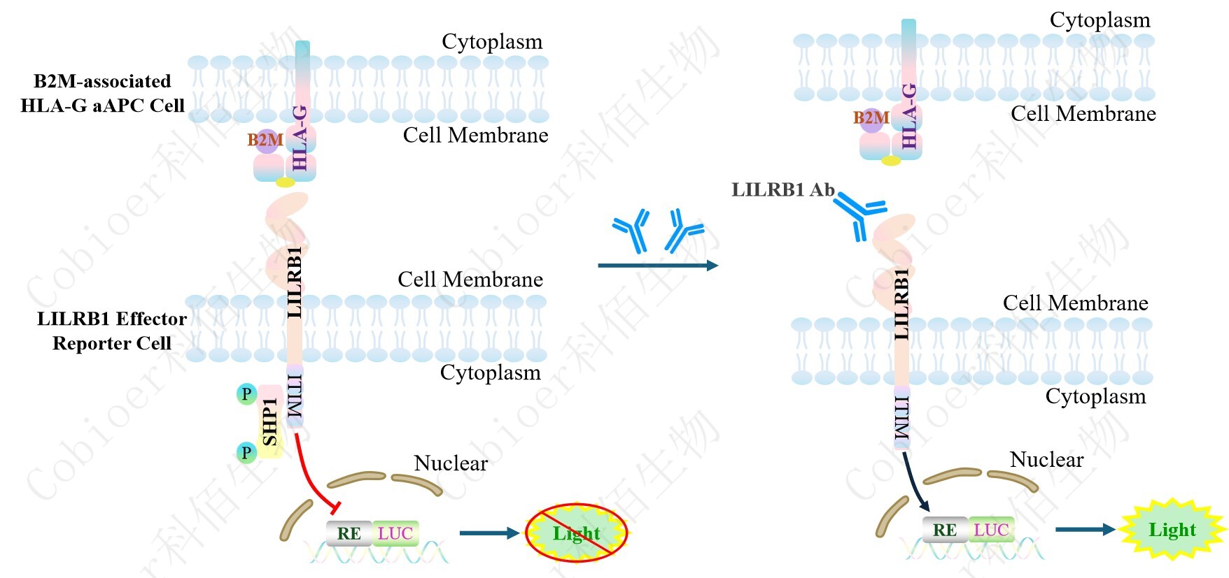 LILRB1 Effector Reporter Cell 報告基因藥靶模型很好的模擬了體內 LILRB1 的信號轉導過(guò)程,原理見(jiàn)下圖所示。![]() Figure 1. LILRB1 Effector Reporter Cell 模型原理圖 |