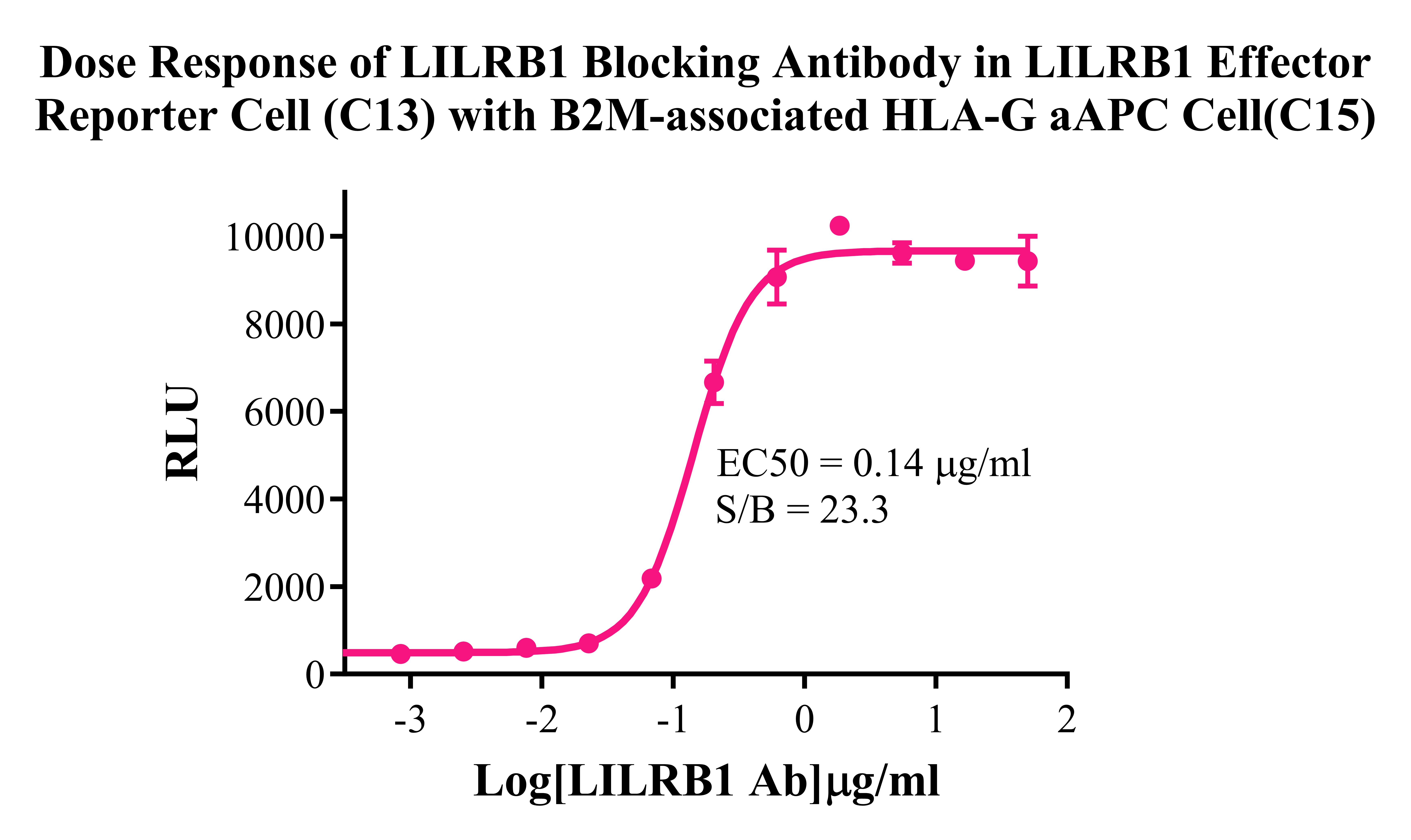 Figure 2.Dose Response of LILRB1 Blocking Antibody in LILRB1 Effector Reporter Cell (C13)With B2M-associated HLA-G/aAPC Cells (C15). |