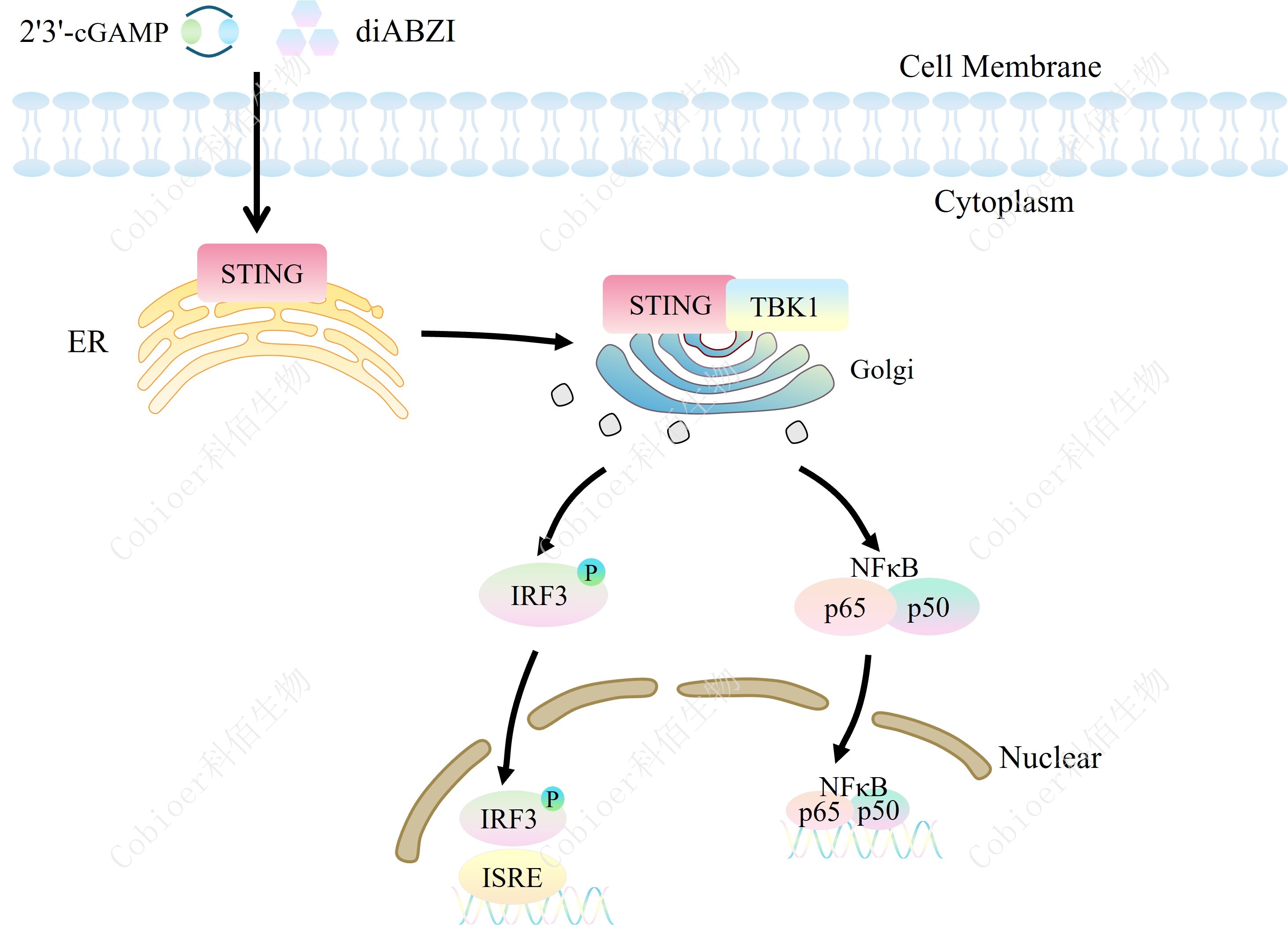 STING(干擾素基因刺激因子)又稱(chēng) MPYS、TMEM173、MITA 和 ERIS,是一種跨膜蛋白,是環(huán)狀二核苷酸(CDN)的直接傳感器。CDN 是細菌信號轉導中普遍存在的第二信使分子,是哺乳動(dòng)物細胞的防御觸發(fā)器。當細菌病原體攻擊時(shí),釋放到細胞中的 CDN 直接與 STING 結合,激活的 STING 和 TANK 結合激酶-I (TBK1) 相互作用以誘導活性干擾素調節因子 (IRF3) 二聚體,然后該二聚體與細胞核中的干擾素刺激反應元件 (ISRE) 結合并導致 IFN-α/β 的產(chǎn)生。IFNβ 的產(chǎn)生是 STING 活化的標志。腫瘤微環(huán)境(TME)中由于天然免疫產(chǎn)生的信號傳導是導致腫瘤特異性 T 細胞激活和腫瘤浸潤性淋巴細胞(TIL)浸潤的關(guān)鍵因素。其中尤其以 I 型 IFN 對腫瘤特異性 T 細胞的活化最為關(guān)鍵。因此,STING 激動(dòng)劑可以通過(guò)誘導Ⅰ型干擾素基因的表達,激活包括樹(shù)突狀細胞等免疫刺激細胞,改變腫瘤微環(huán)境并誘導腫瘤特異性 T 細胞的產(chǎn)生,從而通過(guò)調節免疫系統達到抗腫瘤的目的。 | |