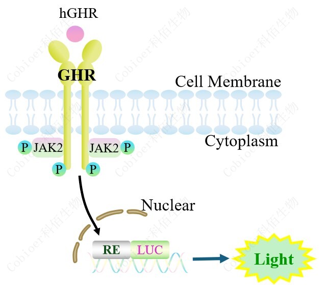 GHR Effector Reporter Cell 報告基因藥靶模型很好的模擬了體內 GHR 的信號轉導過(guò)程, 原理見(jiàn)下圖所示。![]() Figure 1. : GHR Effector Reporter Cell 細胞模型原理圖 |