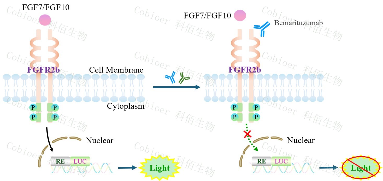 FGFR2b Effector Reporter Cell 報告基因藥靶模型很好的模擬了體內 FGFR2b 的信號轉 導過(guò)程,原理見(jiàn)圖 所示。![]() Figure 1. FGFR2b Effector Reporter Cell 細胞模型原理圖 |