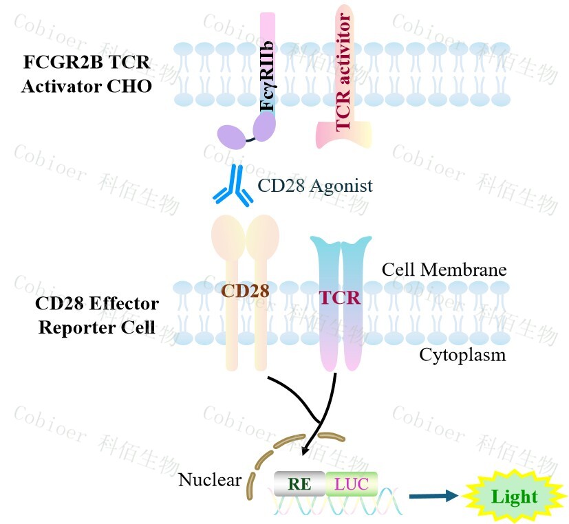 CD28 Effector Reporter Cell 報告基因藥靶模型很好的模擬了體內 CD28 的信號轉導過(guò) 程,原理見(jiàn)下圖所示。 ![]() Figure 1. CD28 Effector Reporter Cell 細胞模型原理圖 |