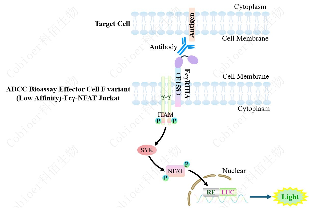 ADCC Bioassay Effector Cell F variant (Low Affinity)-Fcγ-NFAT Jurkat 報告基因藥靶模型 很好的模擬了體內 ADCC 的信號轉導過(guò)程,原理見(jiàn)下圖所示。