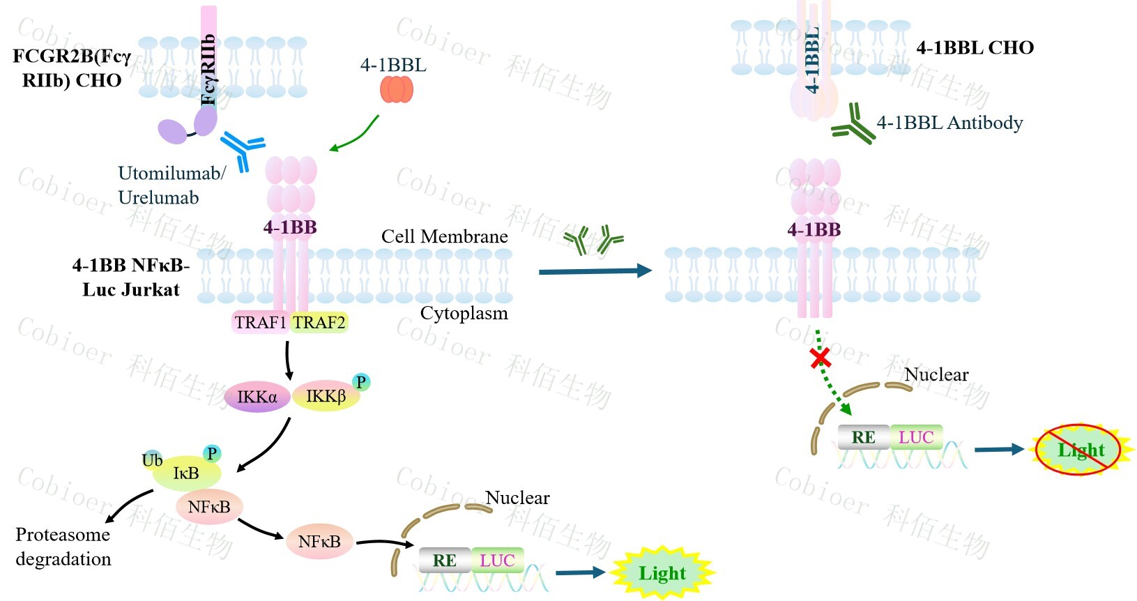 4-1BB NFκB-Luc Jurkat 報告基因藥靶模型很好的模擬了體內 4-1BB 的信號轉導過(guò)程, 原理見(jiàn)下圖所示。
