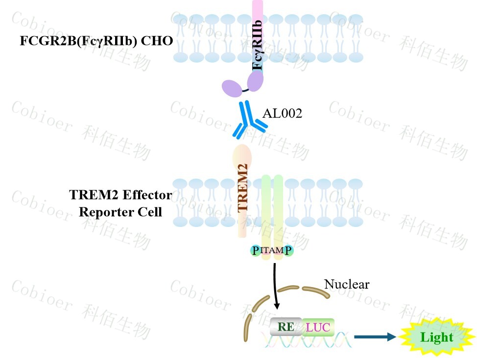 TREM2 Effector Reporter 報告基因藥靶模型很好的模擬了體內 TREM2 的信號轉導過(guò)程, 原理見(jiàn)下圖所示。