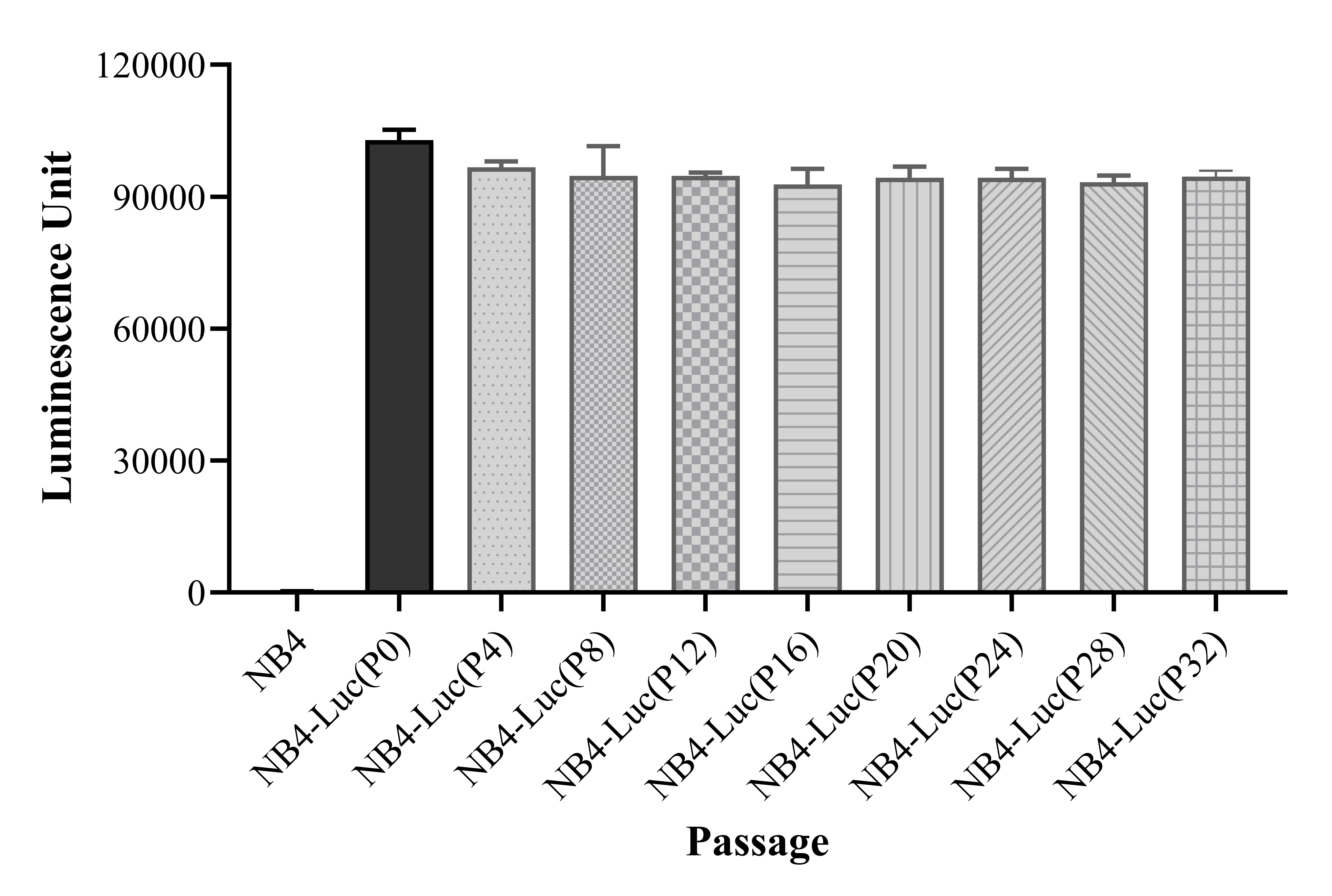 Figure 1. Stablity test results. NB4-Luc showed at least 32 passage stability with similar luminescence unit. |