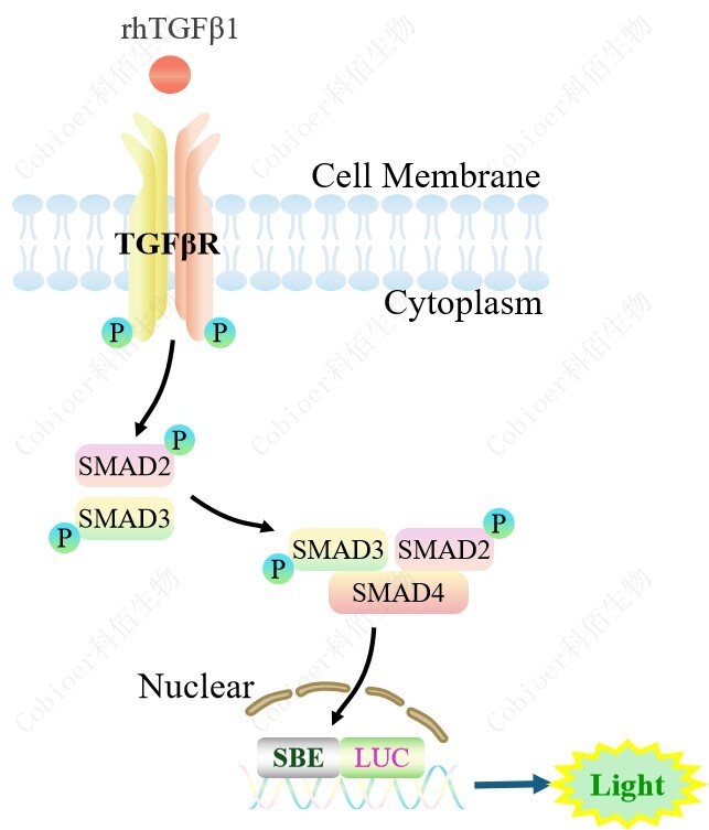 SBE-Luc CHO 報告基因細胞,是由 SBE 調控并表達 Luc 熒光素酶報告 基因的 CHO 細胞。TGF-β與受體結合,激活 SBE 的原理見(jiàn)下圖所示。