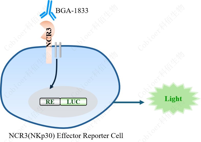 NCR3(NKp30) Effector Reporter 報告基因藥靶模型很好的模擬了體內 NKp30 的信號 轉導過(guò)程,原理見(jiàn)下圖所示。![]() Figure 1. NCR3(NKp30) Effector Reporter 細胞模型原理圖 |