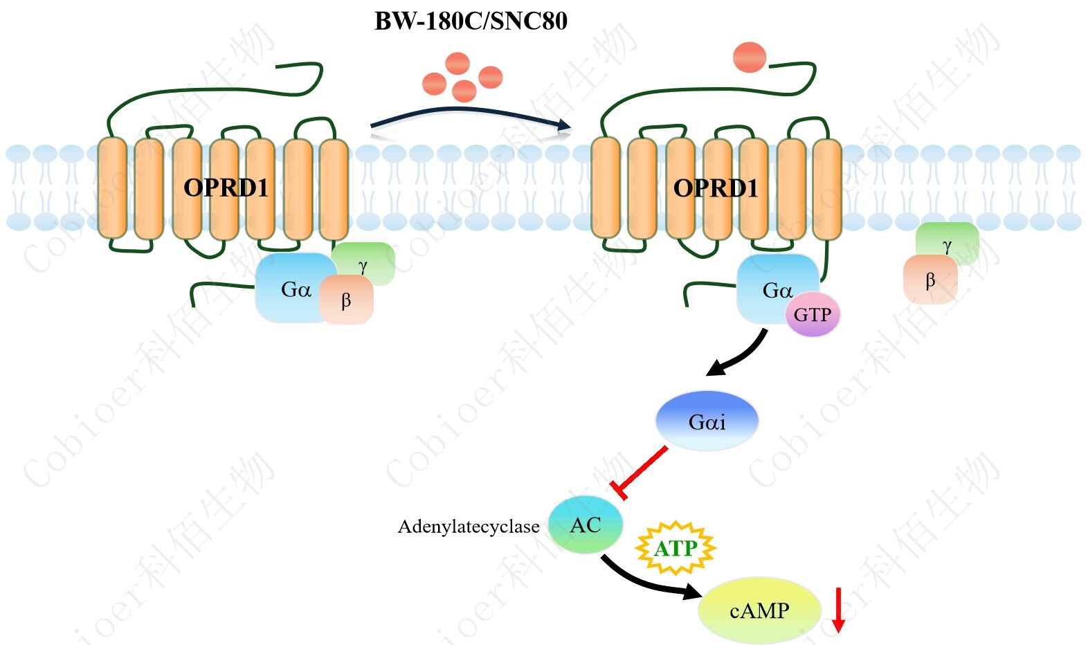 阿片受體家族包括κ-阿片受體(KOP)、 δ-阿片受體(DOP)、µ-阿片受體(MOP) 和痛覺(jué)肽阿片受體(NOP),均屬于 G 蛋白偶聯(lián)受體,主要通過(guò)偶聯(lián)下游 Gi 蛋白發(fā)揮功 能。OPRD1 是一種 G 蛋白偶聯(lián)受體,作為內源性腦啡肽和其他阿片亞群的受體。配體結合 引起構象改變,通過(guò)鳥(niǎo)嘌呤核苷酸結合蛋白(G 蛋白)觸發(fā)信號,并調節下游效應物(如腺苷 酸環(huán)化酶)的活性。信號傳導導致腺苷酸環(huán)化酶活性的抑制。它通過(guò)減少鈣離子電流和增加 鉀離子電導來(lái)抑制神經(jīng)遞質(zhì)釋放。它在疼痛的感知和阿片介導的鎮痛中起作用。 |