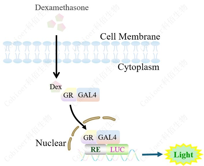 由 GR-GAL4 調 控并表達 Luc 熒光素酶報告基因的 HEK293 細胞。Dexamethasone (Hexadecadrol,地塞米 松)是糖皮質(zhì)激素受體 (Glucocorticoid Receptor)激動(dòng)劑、凋亡誘導劑,原理見(jiàn)下圖所示。![]() Figure 1. GR-GAL4 Luciferase Reporter HEK293 細胞原理示意圖 |