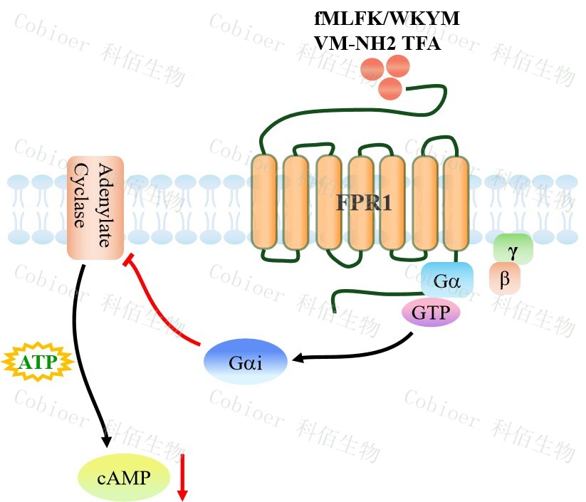 cAMP 在 G 蛋白偶聯(lián)受體(GPCR)信號轉導中是一種關(guān)鍵的第二信使。當配體結合 到 GPCR,構象發(fā)生變化,激活受體接著(zhù)激活 G 蛋白,Gi 的激活導致腺苷酸環(huán)化酶調控 cAMP 的下調。FPR1 CHO 藥靶模型很好的模擬了體內 FPR1 的信號轉導過(guò)程,原理見(jiàn)下圖 所示。