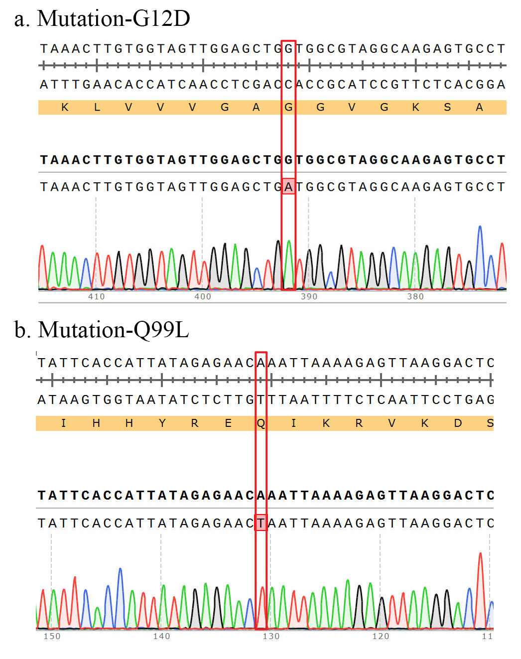 1.WB of KRAS [G12D&Q99L] BaF3 Figure 2. WB of KRAS [G12D&Q99L] BaF3 2.Sanger of KRAS [G12D&Q99L] BaF3 |