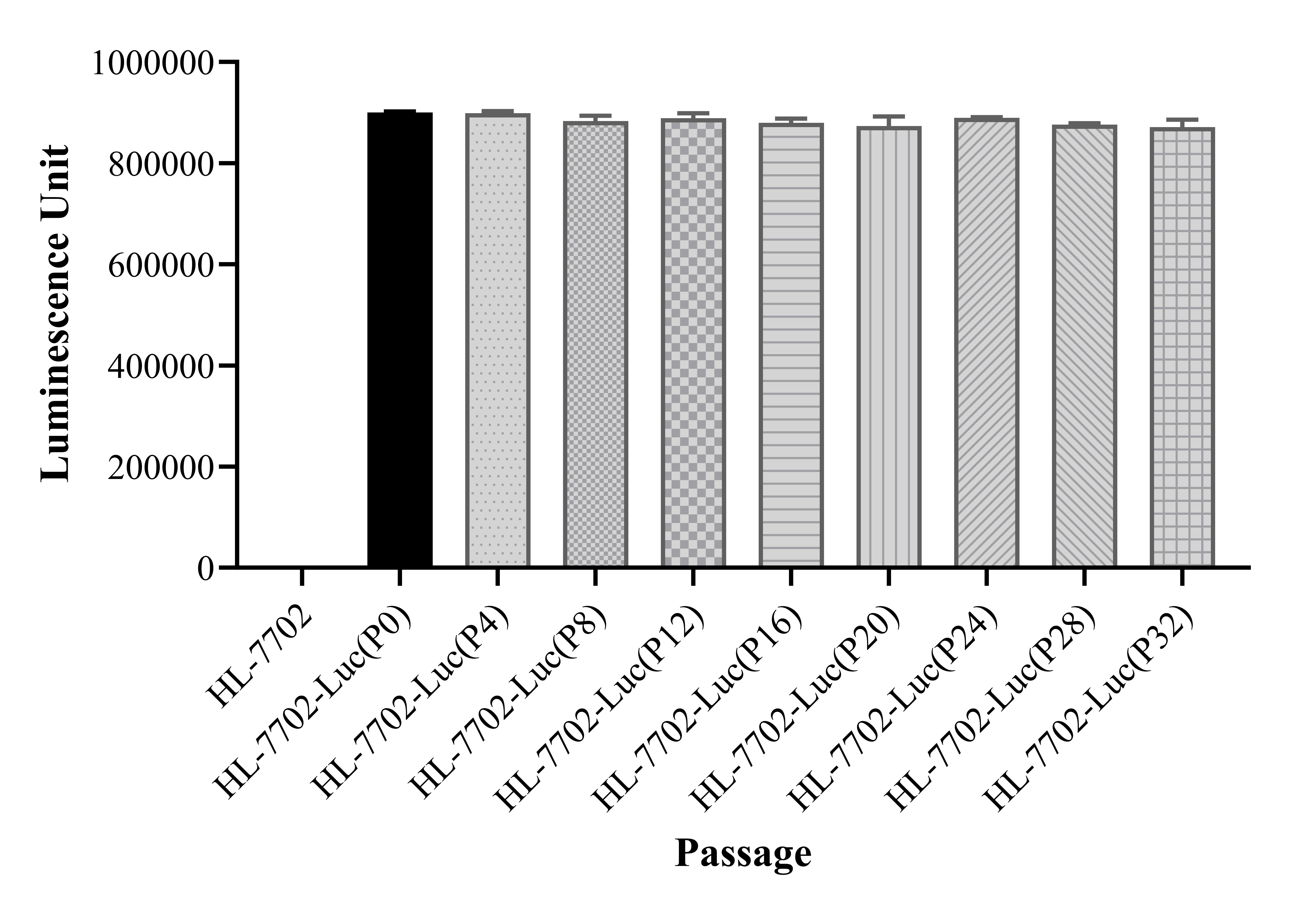 Figure 1. Stablity test results. HL-7702-Luc showed at least 32 passage stability with similar luminescence unit. |