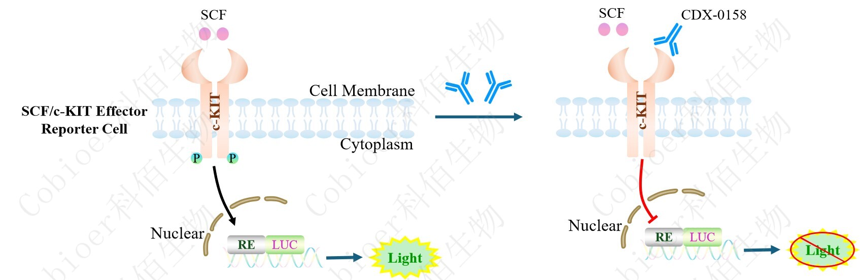 SCF/c-KIT Effector Reporter Cell 報告基因藥靶模型很好的模擬了體內 SCF/c-KIT 的信號轉導過(guò)程,原理見(jiàn)下圖所示。