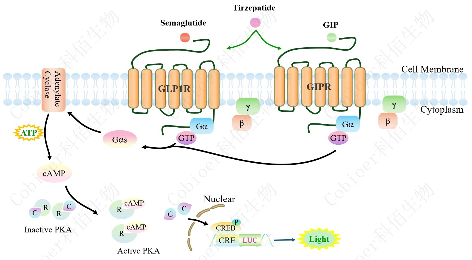 GLP1R&GIPR Dual Reporter Cell 報告基因藥靶模型很好的模擬了體內 GLP1R&GIPR的信號轉導過(guò)程,原理見(jiàn)下圖所示。