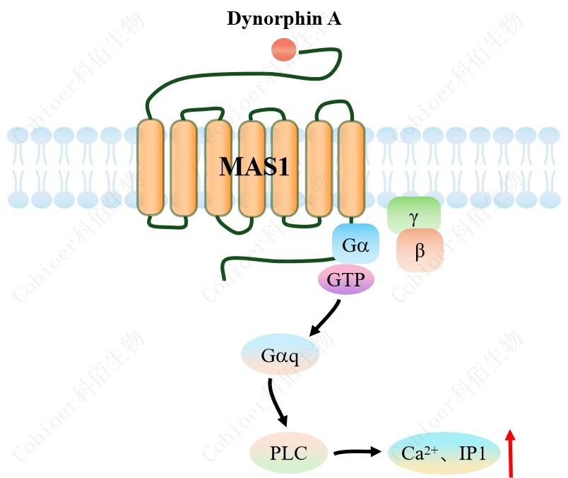 MAS1 可以通過(guò) Gq 蛋白的信號通路,調控 IP1 的升高。MAS1 與配體結合,導致 Gαq 亞基的激活,觸發(fā) PLC-γ,從而產(chǎn)生兩個(gè)第二信使:IP3 和 DAG,它們參與細胞內鈣動(dòng)員。 由于 IP3 在代謝上不穩定,因此測量通路激活的替代標志物 IP1 作為檢測標準。