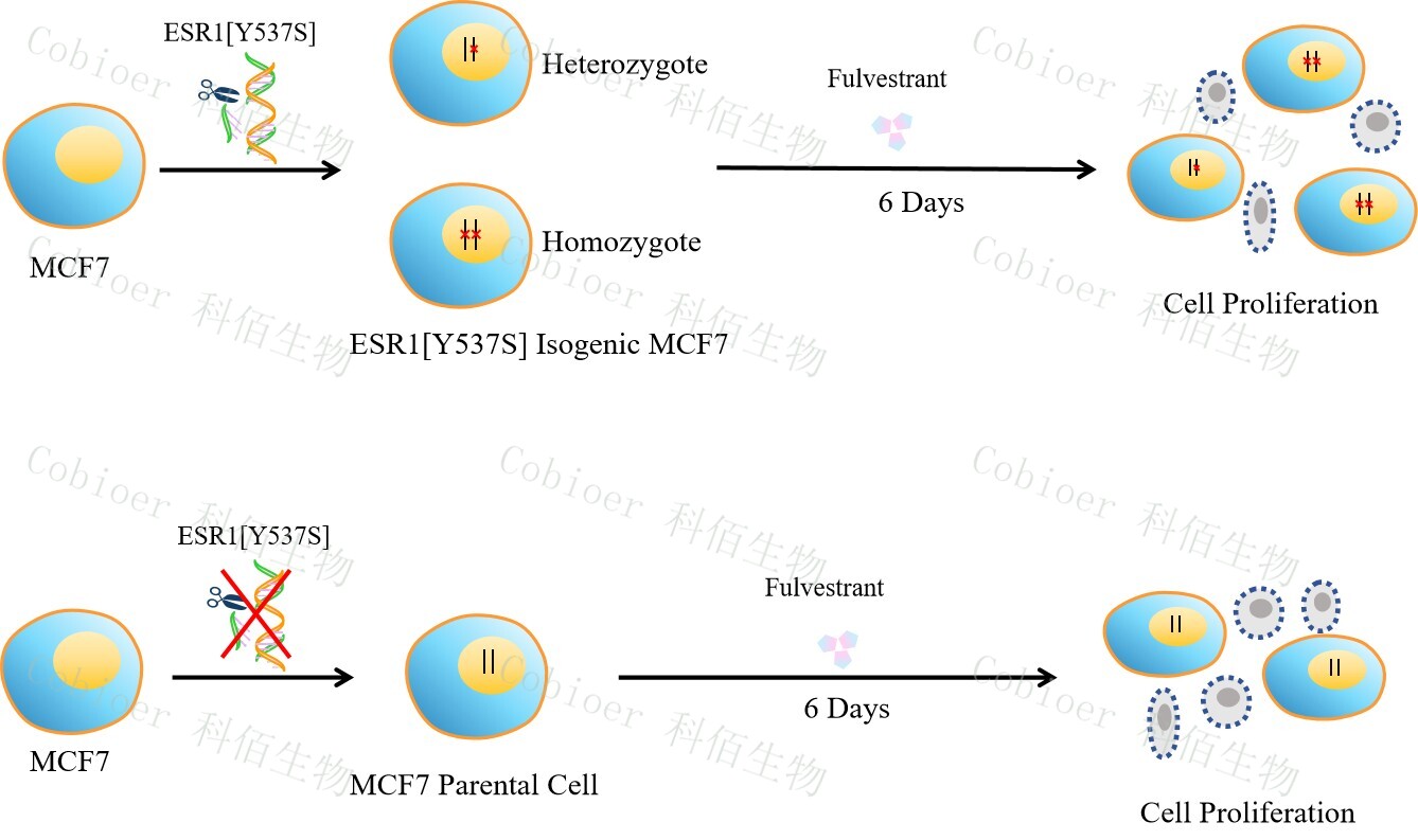 ESR1[Y537S] Isogenic MCF7 藥靶細胞,通過(guò)基因編輯的方式將 ESR1 的 537 位氨基酸酪氨酸(Y)突變?yōu)榻z氨酸(S)。![]() Figure 1. ESR1[Y537S] Isogenic MCF7 原理示意圖 |