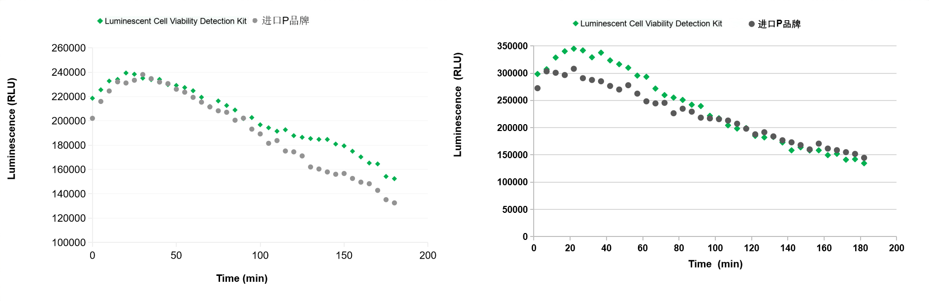 2. 半衰期 ![]() Figure 3. 生物發(fā)光穩定性的檢測。分別使用Luminescent Cell Viability Detection Kit和進(jìn)口P公司同類(lèi)對照對2萬(wàn)個(gè)/孔CTLL-2細胞(左圖)和5萬(wàn)個(gè)/孔UC-MSC細胞(右圖)進(jìn)行持續3小時(shí)的生物發(fā)光強度檢測。