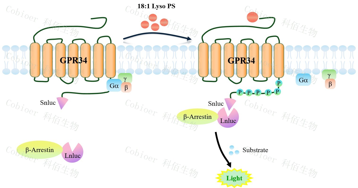 GPR34 β-Arrestin CHO 報告基因藥靶模型很好的模擬了體內 GPR34/β-Arrestin 的信號 轉導過(guò)程,原理見(jiàn)下圖所示。當缺乏配體刺激時(shí),β-Arrestin 不與 GPR34 結合,融合β- Arrestin 的熒光素酶處于失活構象,當 GPR34 遭遇配體刺激時(shí),融合熒光素酶報告基因的 β-Arrestin 被招募,使熒光素酶報告基因處于激活狀態(tài),加入其底物后發(fā)光信號增強。![]() Figure 1. GPR34 β-Arrestin CHO 細胞模型原理圖 |