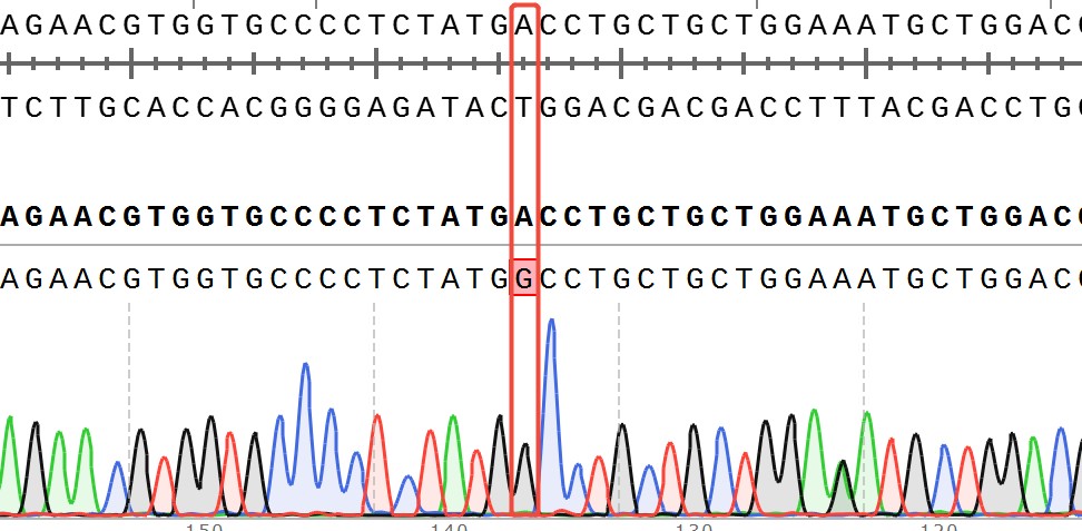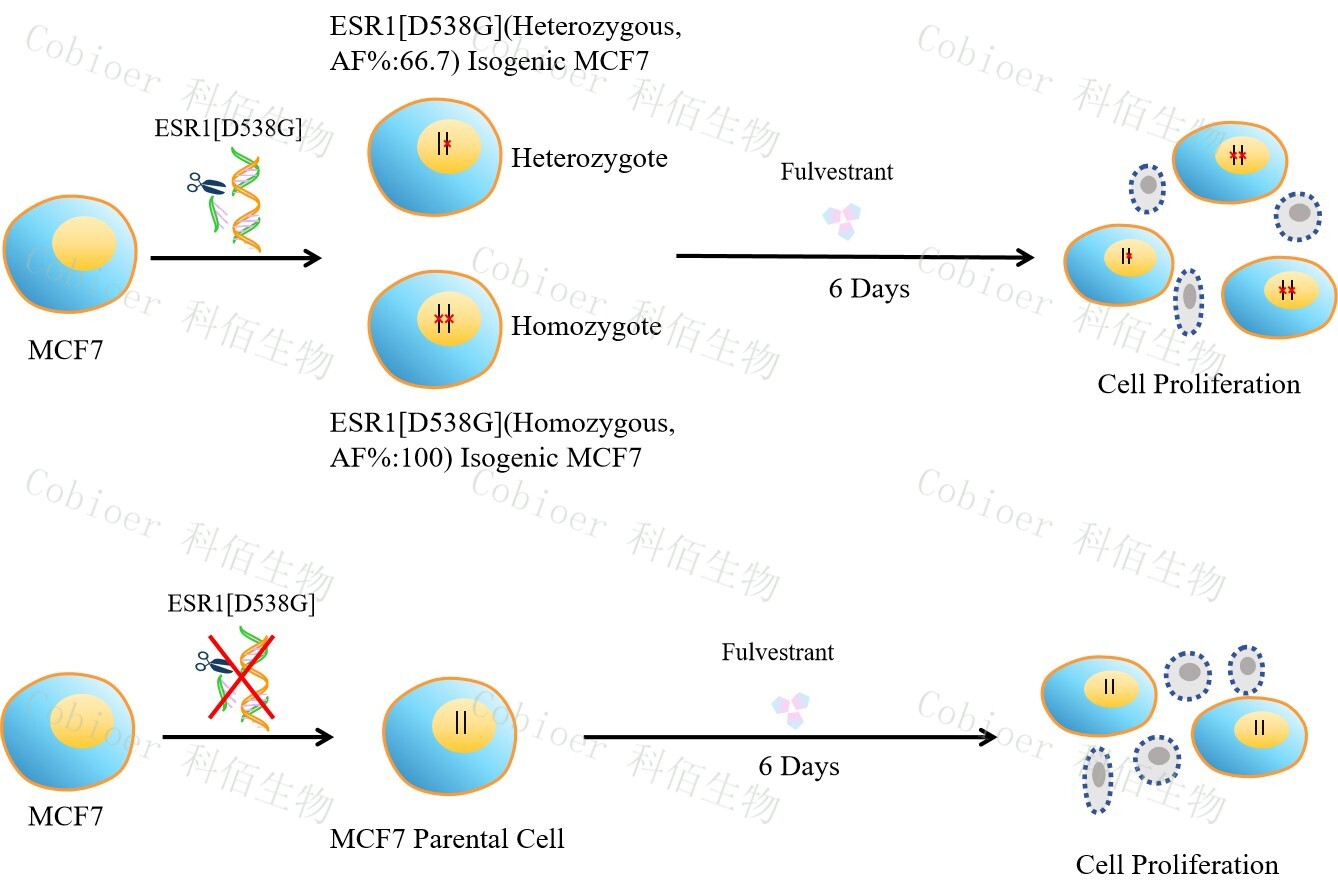 ESR1[D538G](Homozygous,AF%:100) Isogenic MCF7 藥靶細胞,通過(guò)基 因編輯的方式將 ESR1 的 538 位氨基酸天冬氨酸(D)突變?yōu)楦拾彼幔℅)。![]() Figure 1. ESR1[D538G](Homozygous,AF%:100) Isogenic MCF7 原理示意圖 |