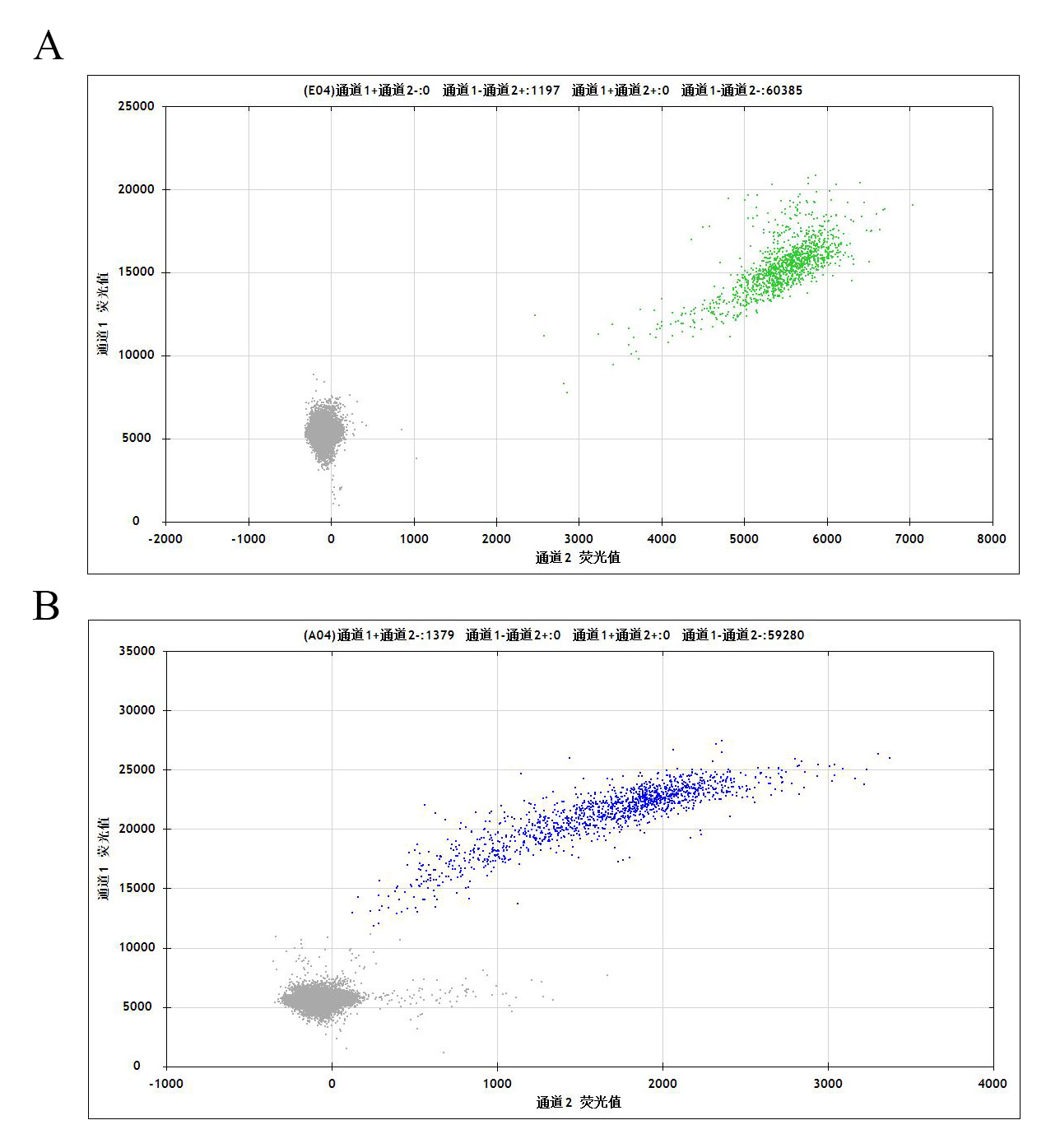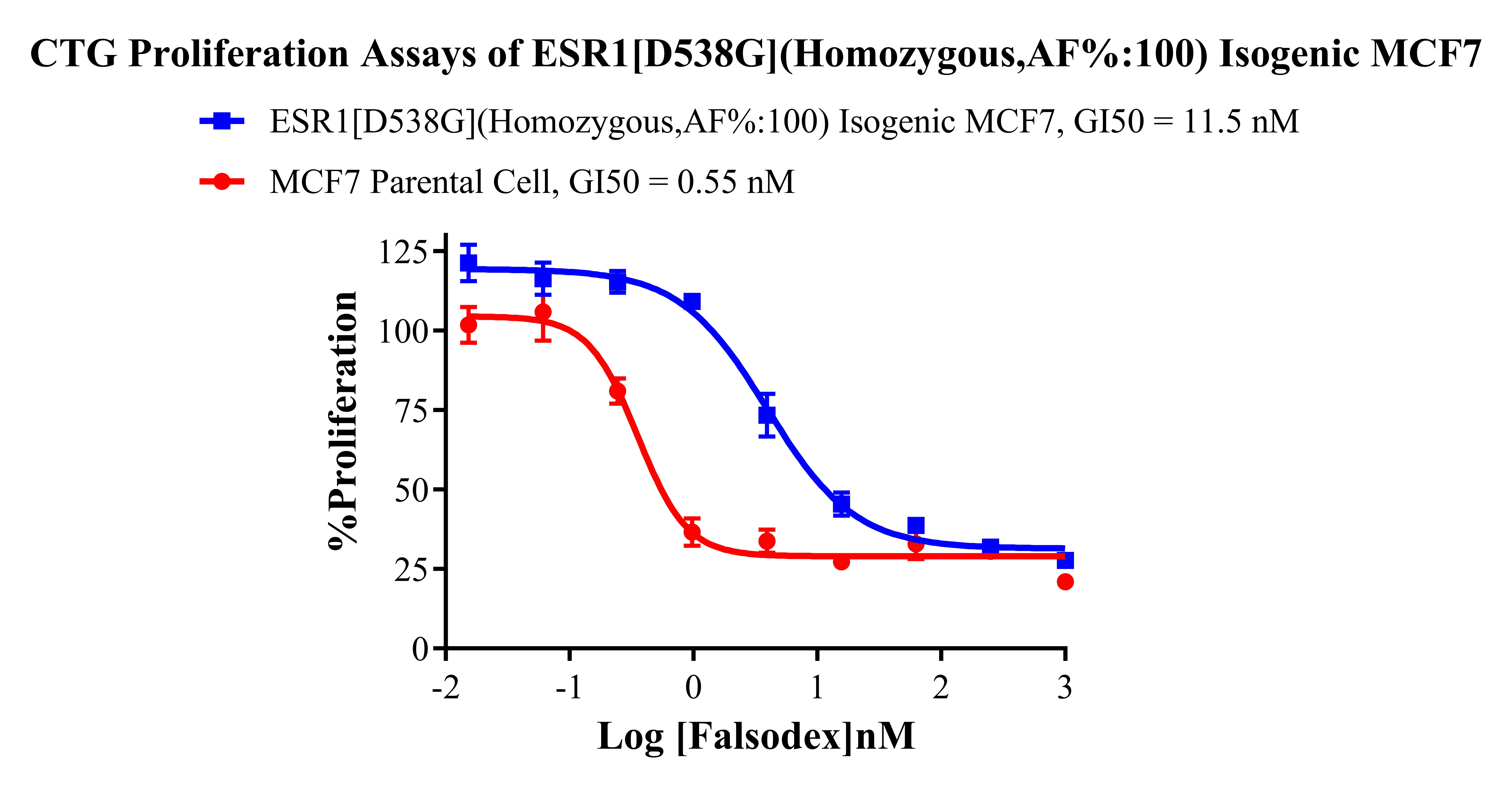 ![]() Figure 2. Sanger of ESR1[D538G](Homozygous,AF%:100) Isogenic MCF7. ![]() Figure 3. A: MCF7 Parental Cell;B:ESR1[D538G](Homozygous,AF%:100)Isogenic MCF7 通道 2 藍色微滴代表 ESR1[D538G]突變陽(yáng)性,通道 2 綠色微滴代表該位點(diǎn)為陰性野生型 ![]() Figure 4. CTG Proliferation Assays of ESR1 [D538G](Homozygous,AF%:100) Isogenie MCF7. |