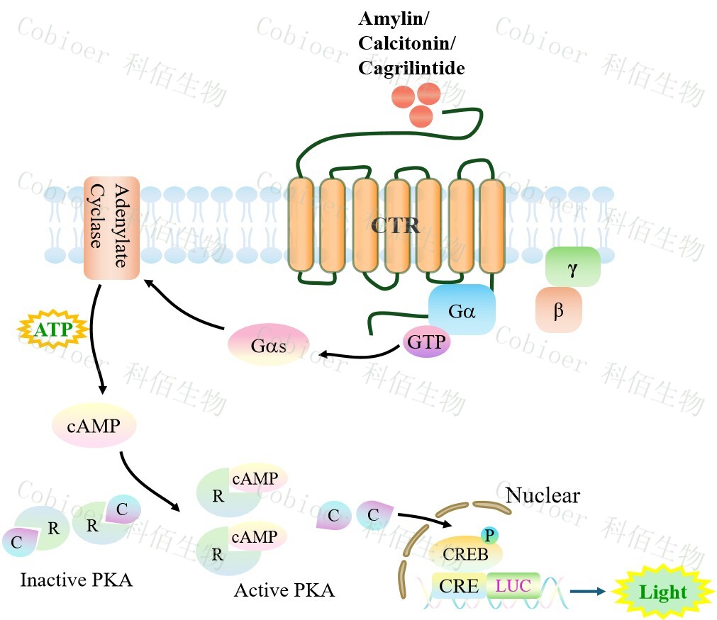 CTR CRE-Luc CHO 報告基因藥靶模型很好的模擬了體內 CTR 的信號轉導過(guò)程,原理見(jiàn)下圖所示。
