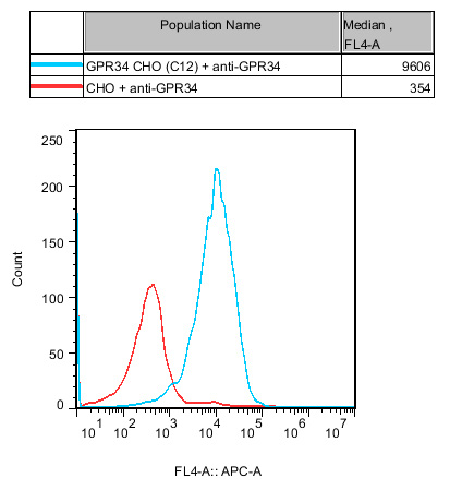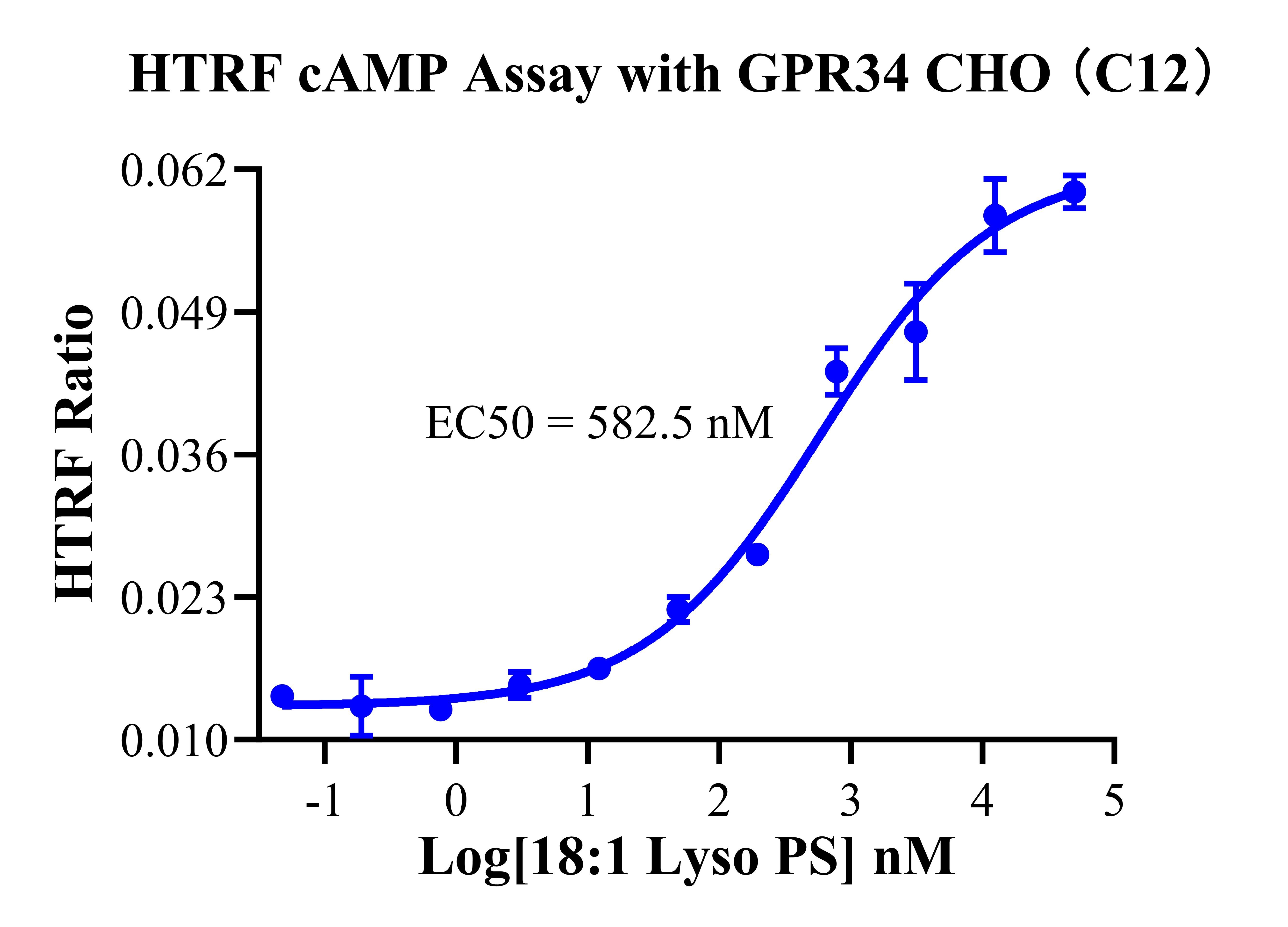 cAMP 在 G 蛋白偶聯(lián)受體(GPCR)信號轉導中是一種關(guān)鍵的第二信使。當配體結合 到 GPCR,構象發(fā)生變化,激活受體接著(zhù)激活 G 蛋白,Gi 的激活導致腺苷酸環(huán)化酶調控 cAMP 的下調。GPR34 CHO 藥靶模型很好的模擬了體內 GPR34 的信號轉導過(guò)程,原理見(jiàn)下圖所示。![]() Figure 1. GPR34 CHO 細胞模型原理圖 |