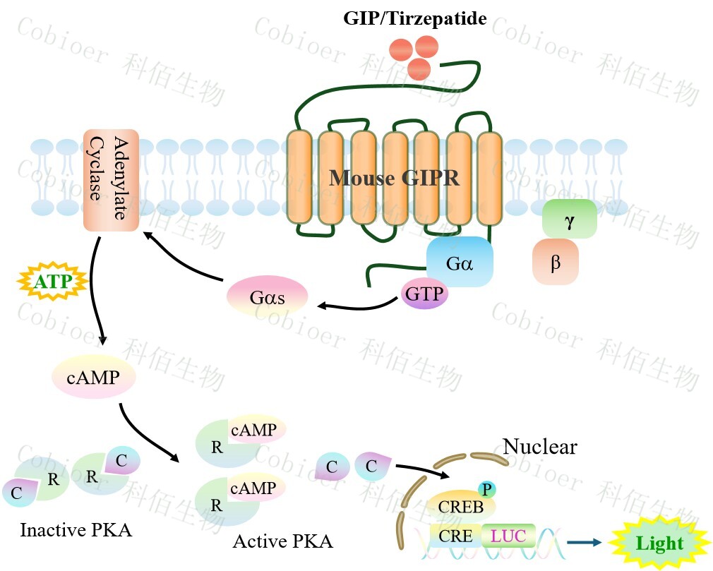 Mouse GIPR CRE-Luc HEK293 報告基因藥靶模型很好的模擬了體內 GIPR 的信號轉導過(guò)程,原理見(jiàn)下圖所示。