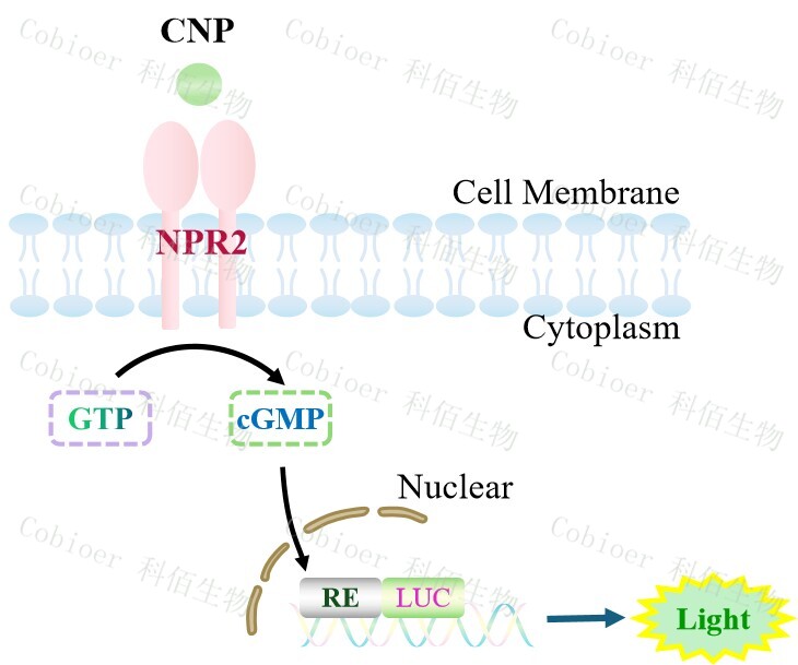 NPR2 Effector Reporter Cell 報告基因藥靶模型很好的模擬了體內 NPR2 的信號轉導過(guò)程,原理見(jiàn)下圖所示。
