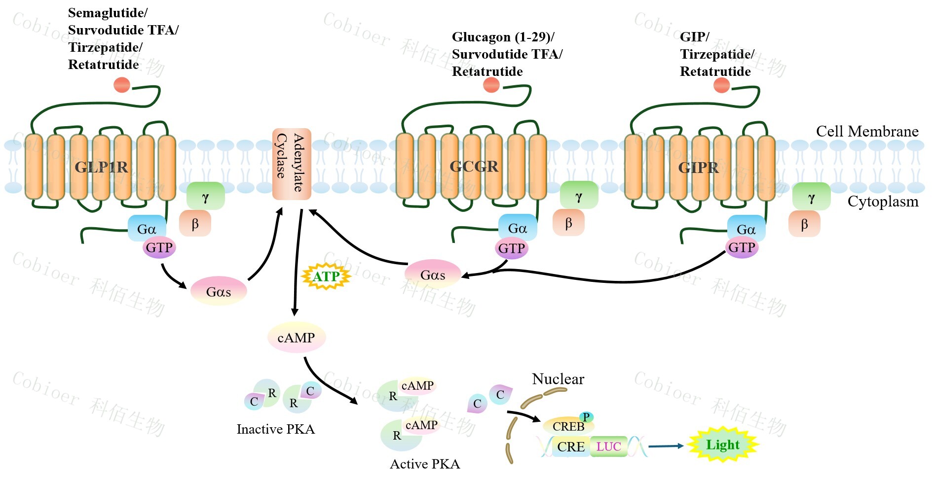 GLP1R&GCGR&GIPR Triple Reporter Cell 報告基因藥靶模型很好的模擬了體內GLP1R&GCGR&GIPR 的信號轉導過(guò)程,原理見(jiàn)圖1 所 Figure 1. GLP1R&GCGR&GIPR Triple Reporter Cell 細胞模型原理圖
