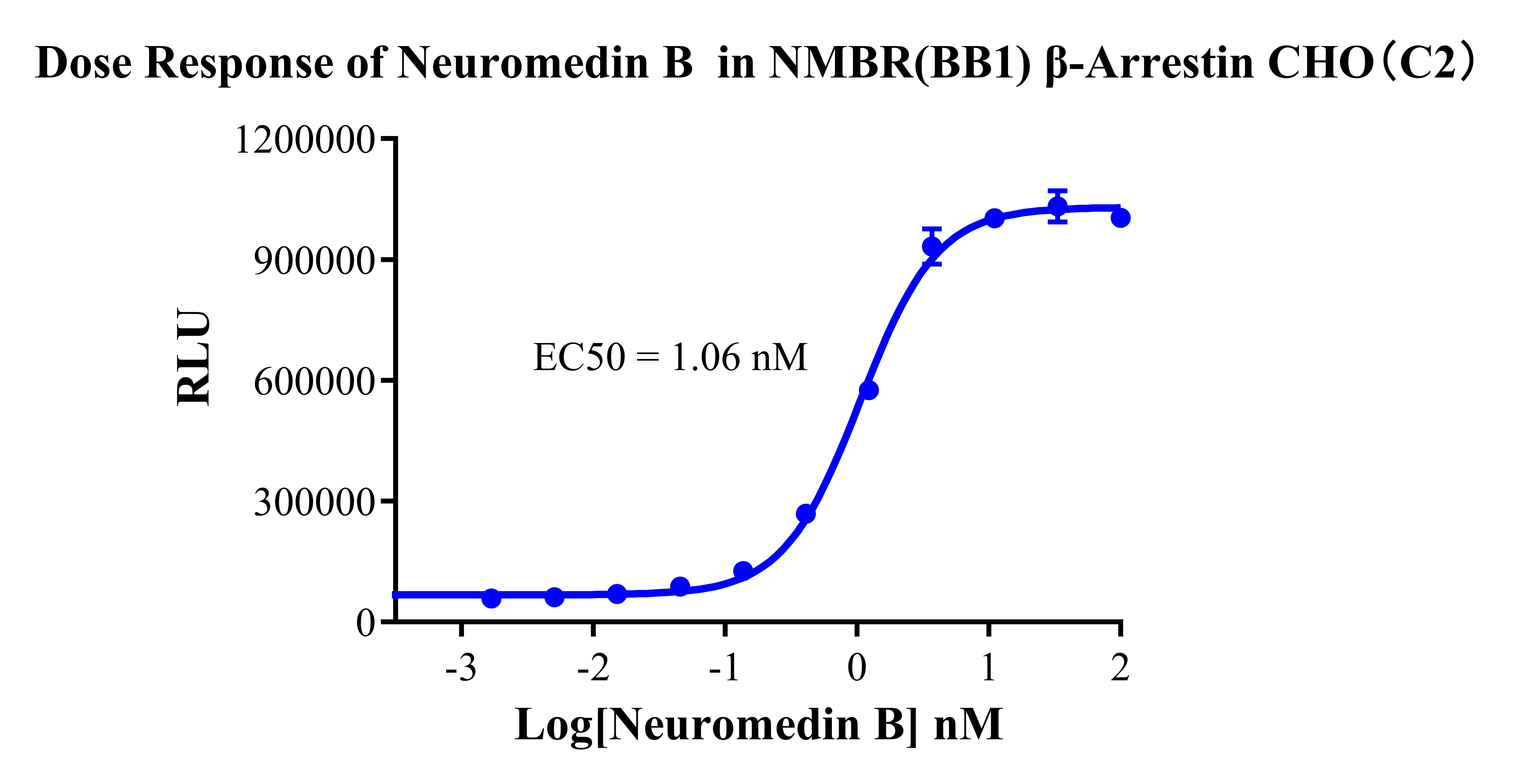 NMBR(BB1) β-Arrestin CHO 報告基因藥靶模型很好的模擬了體內 NMBR/β-Arrestin 的信號轉導過(guò)程,原理見(jiàn)下圖所示。當缺乏配體刺激時(shí),β-Arrestin 不與 NMBR 結合,融合β- Arrestin 的熒光素酶處于失活構象,當 NMBR 遭遇配體刺激時(shí),融合熒光素酶報告基因的 β-Arrestin 被招募,使熒光素酶報告基因處于激活狀態(tài),加入其底物后發(fā)光信號增強。![]() Figure 1. NMBR(BB1) β-Arrestin CHO 細胞模型原理圖 |