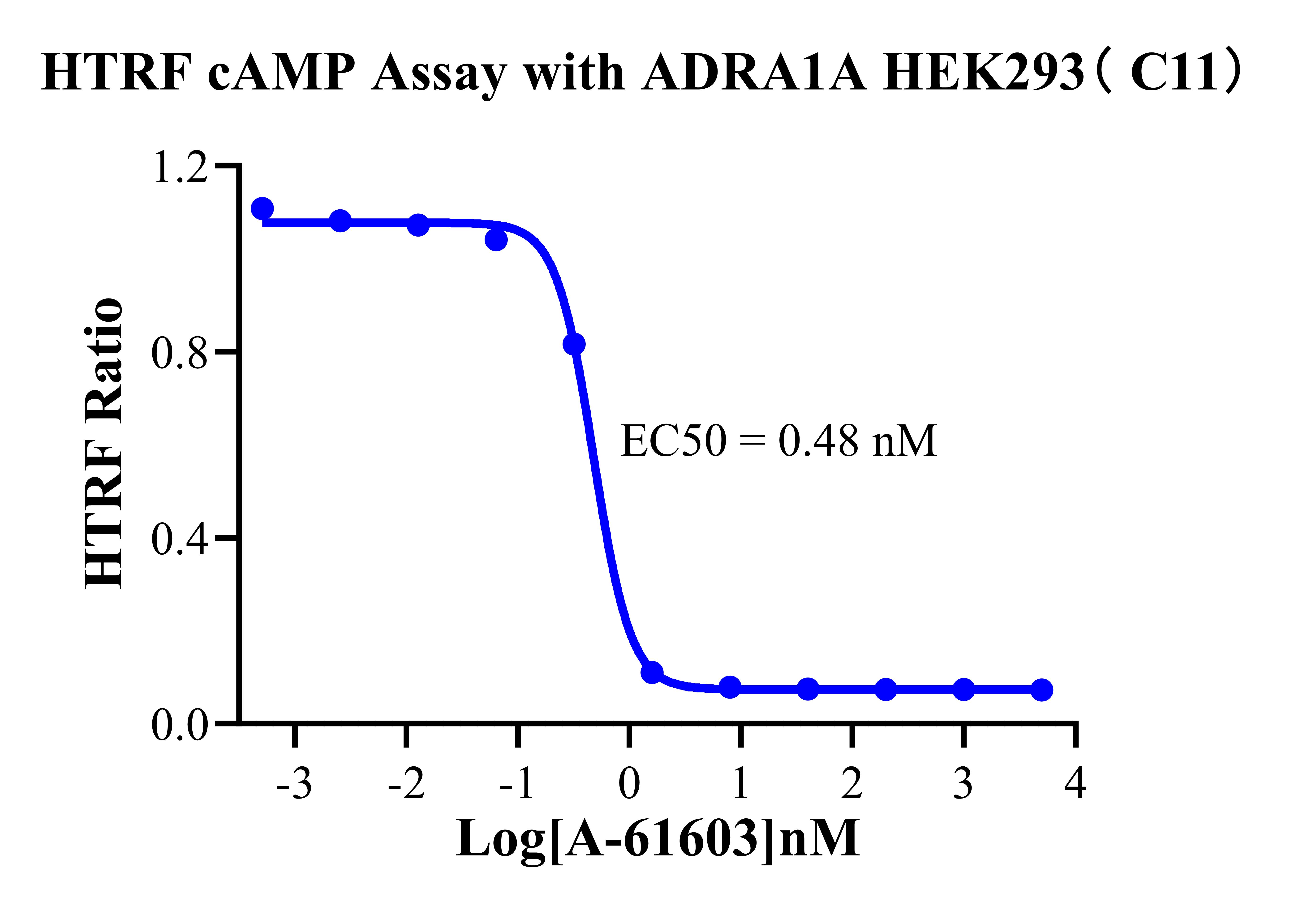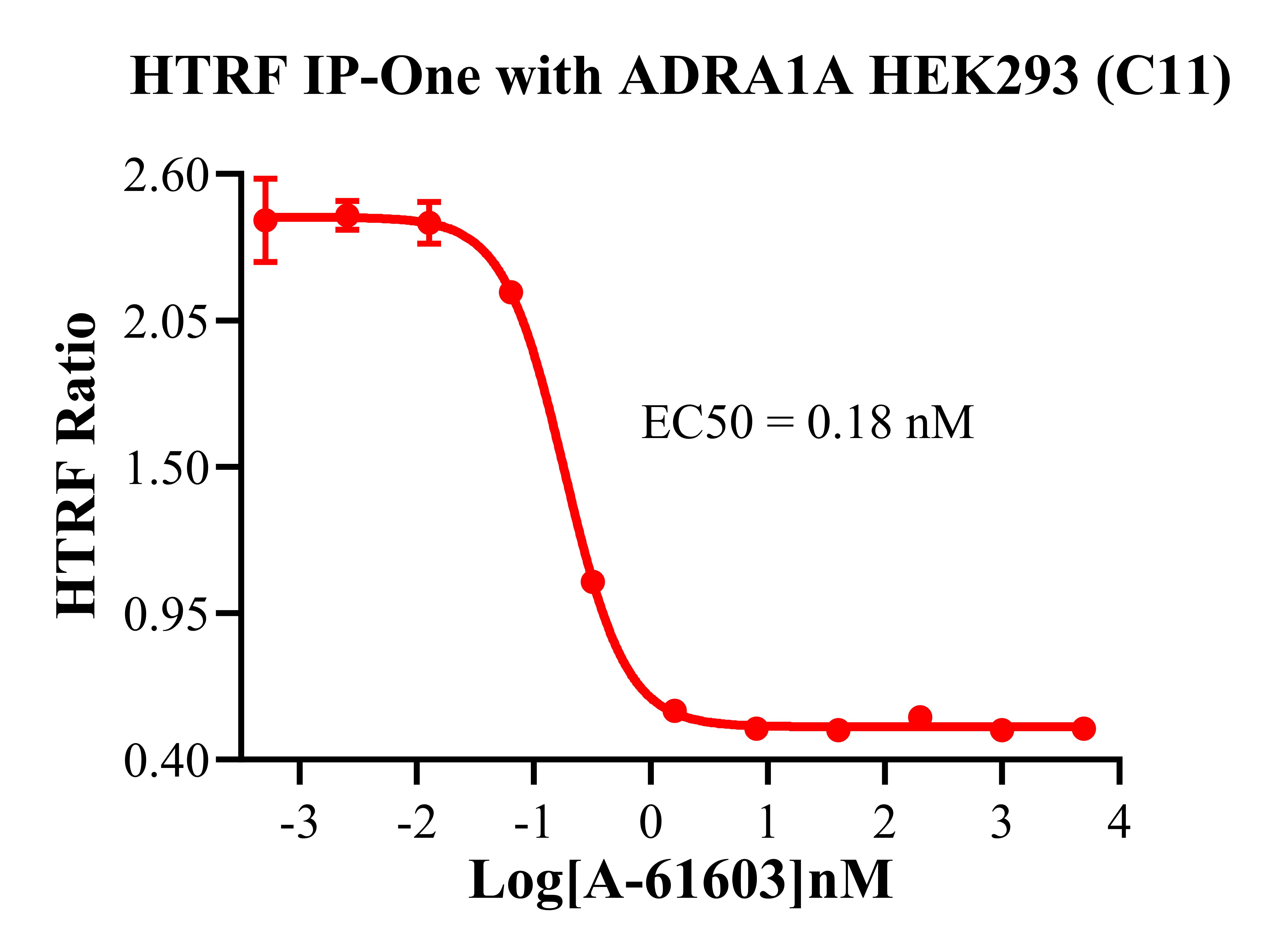 ADRA1A 還可以通過(guò) Gq 蛋白的信號通路,調控 IP1 的升高。ADRA1A 與配體結合, 導致 Gαq 亞基的激活,觸發(fā) PLC-γ,從而產(chǎn)生兩個(gè)第二信使:IP3 和 DAG,它們參與細胞 內鈣動(dòng)員。由于 IP3 在代謝上不穩定,因此測量通路激活的替代標志物 IP1 作為檢測標準。