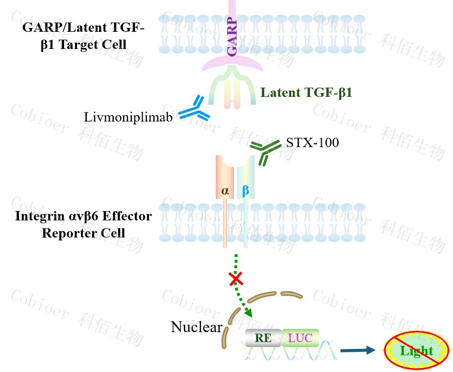 GARP/Latent TGF-β1 Target Cell 作為 Integrin αvβ6 Effector Reporter Cell 的靶細胞,藥 靶模型很好的模擬了體內 Integrin&GARP/Latent TGF-β1 的信號轉導過(guò)程,原理見(jiàn)下圖所示。![]() Figure 1. GARP/Latent TGF-β1 Target Cell 細胞模型圖 |