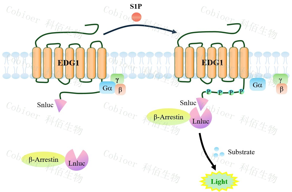 EDG1(S1P1) β-Arrestin CHO 報告基因藥靶模型很好的模擬了體內 EDG1(S1P1)/β- Arrestin 的信號轉導過(guò)程,原理見(jiàn)下圖所 示 。 當缺乏配體刺激時(shí), β-Arrestin 不 與 EDG1(S1P1)結合,融合β-Arrestin 的熒光素酶處于失活構象,當 EDG1(S1P1)遭遇配體刺激 時(shí),融合熒光素酶報告基因的β-Arrestin 被招募,使熒光素酶報告基因處于激活狀態(tài),加入 其底物后發(fā)光信號增強。![]() Figure 1. EDG1(S1P1) β-Arrestin CHO 細胞模型原理圖 |