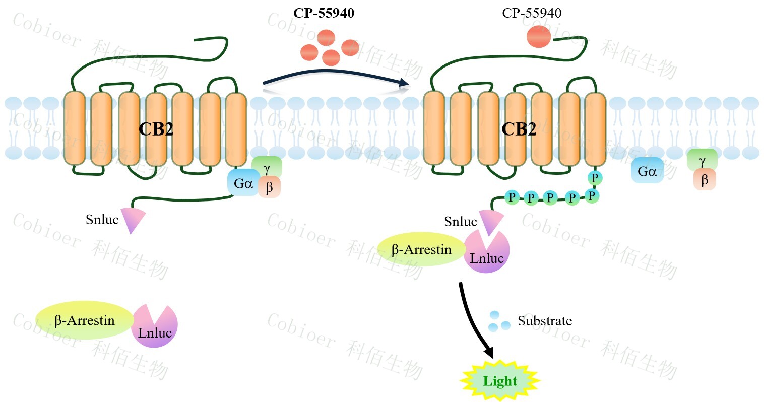 CB2 β-Arrestin CHO 報告基因藥靶模型很好的模擬了體內 CB2/β-Arrestin 的信號轉導過(guò)程,原理見(jiàn)下圖所示。當缺乏配體刺激時(shí),β-Arrestin 不與 CB2 結合,融合β-Arrestin 的熒 光素酶處于失活構象,當 CB2 遭遇配體刺激時(shí),融合熒光素酶報告基因的β-Arrestin 被招 募,使熒光素酶報告基因處于激活狀態(tài),加入其底物后發(fā)光信號增強。![]() Figure 1. CB2 β-Arrestin CHO 細胞模型原理圖 |