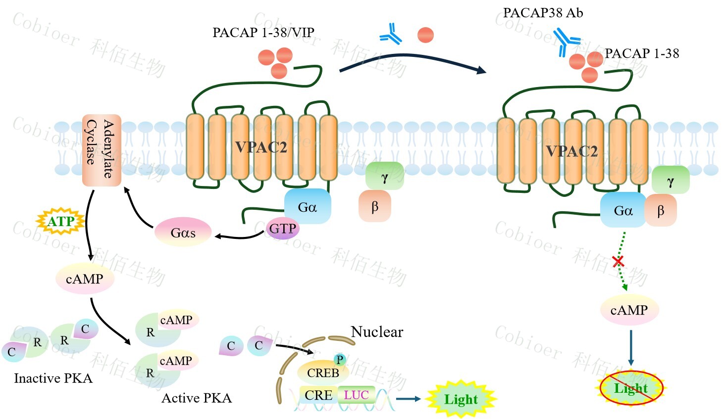 VPAC2 CRE-Luc CHO 報告基因藥靶模型很好的模擬了體內 VPAC2 的信號轉導過(guò)程, 原理見(jiàn)下圖所示。![]() Figure 1. VPAC2 CRE-Luc CHO 細胞模型原理圖 |