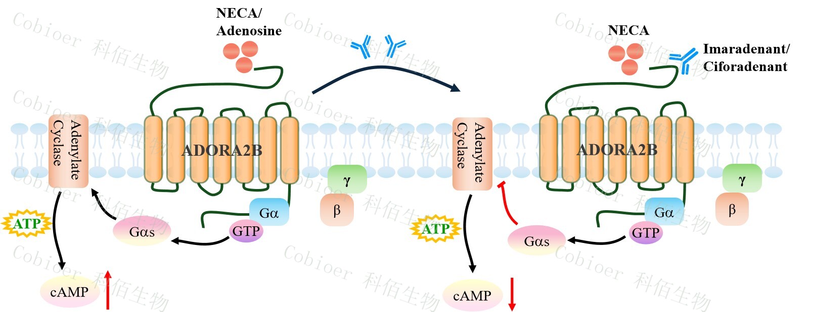 cAMP 在 G 蛋白偶聯(lián)受體(GPCR)信號轉導中是一種關(guān)鍵的第二信使。當配體結合 到 GPCR,構象發(fā)生變化,激活受體接著(zhù)激活 G 蛋白,Gs 的激活導致腺苷酸環(huán)化酶調控 cAMP 的升高。 ADORA2B Gα15 CHO 細胞藥靶模型很好的模擬了體內 ADORA2B 的信號轉導過(guò)程,原理見(jiàn)下圖所示。