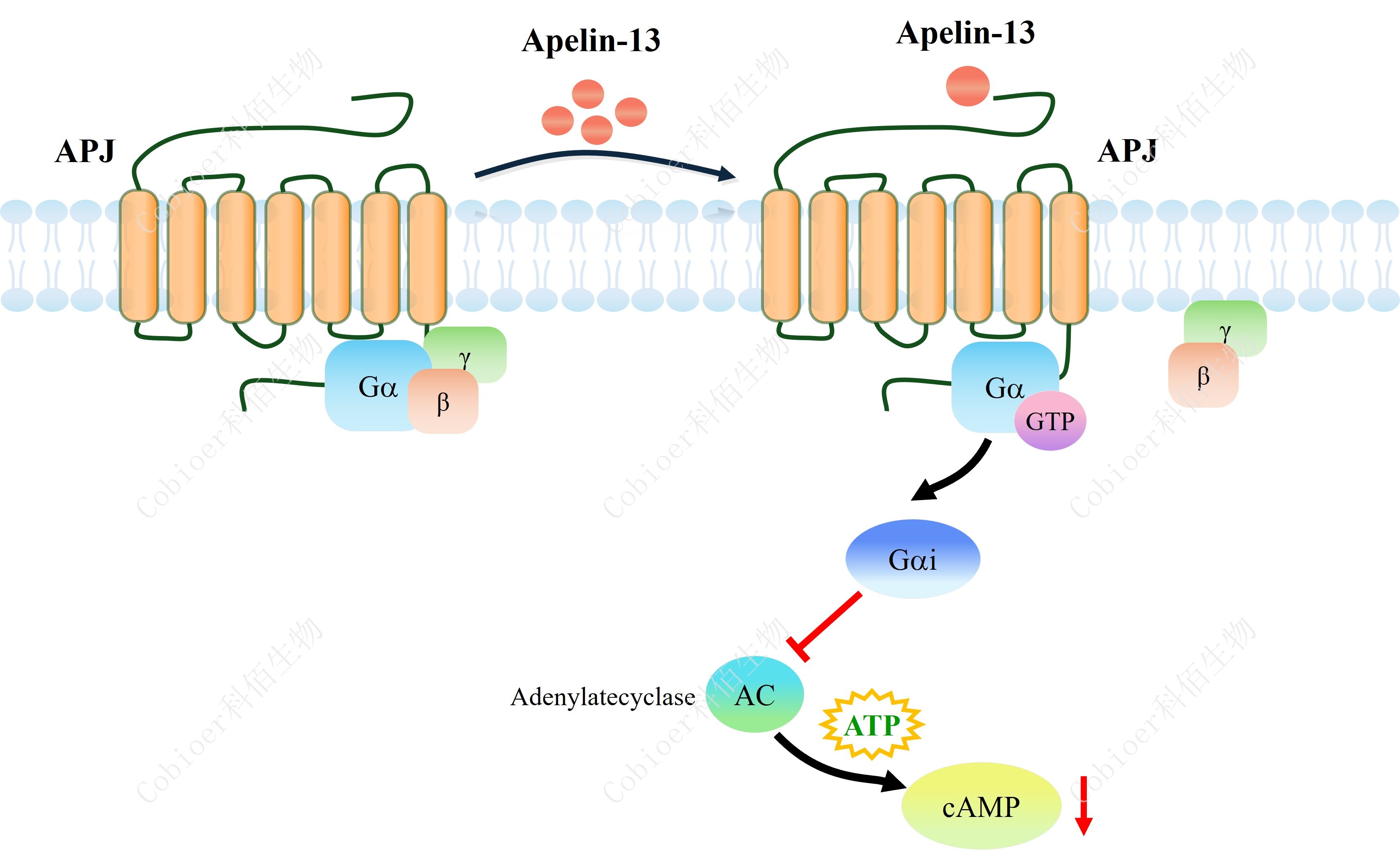 cAMP 在 G 蛋白偶聯(lián)受體(GPCR)信號轉導中是一種關(guān)鍵的第二信使。當配體結合到 GPCR,構象發(fā)生變化,激活受體接著(zhù)激活G蛋白,Gi的激活導致腺苷酸環(huán)化酶調控 cAMP 的下調。APLNR(APJ)藥靶模型很好的模擬了體內 APLNR(APJ)的信號轉導過(guò)程,原 理見(jiàn)下圖所示。 ![]() Figure 1. APLNR(APJ) CHO 細胞模型原理圖