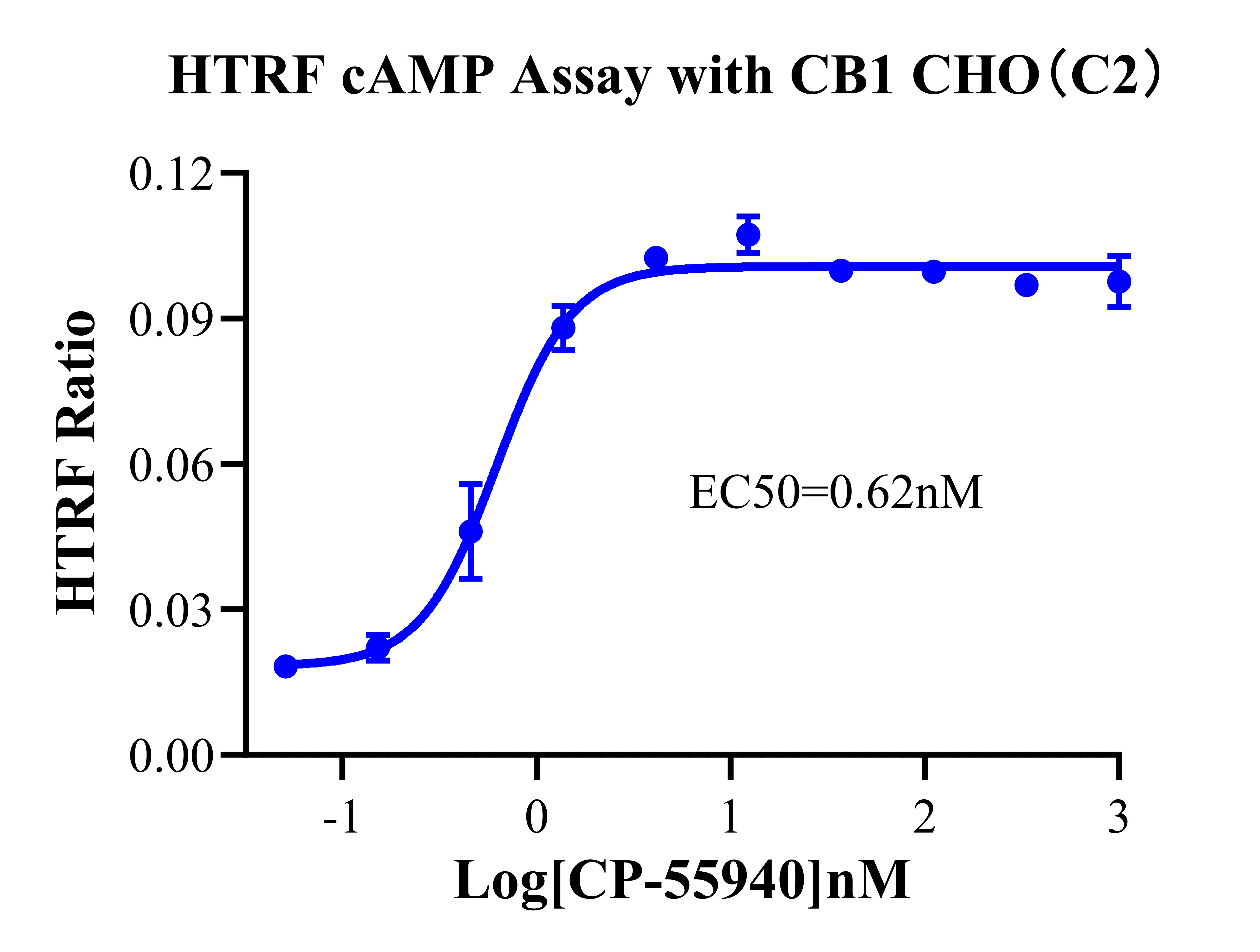 cAMP 在 G 蛋白偶聯(lián)受體(GPCR)信號轉導中是一種關(guān)鍵的第二信使。當配體結合到 GPCR,構象發(fā)生變化,激活受體接著(zhù)激活 G 蛋白,Gi 的激活導致腺苷酸環(huán)化酶調控 cAMP 的下調。CB1 CHO 藥靶模型很好的模擬了體內 CB1 的信號轉導過(guò)程,原理見(jiàn)下圖所示。![]() Figure 1. CB1 CHO 細胞模型原理圖