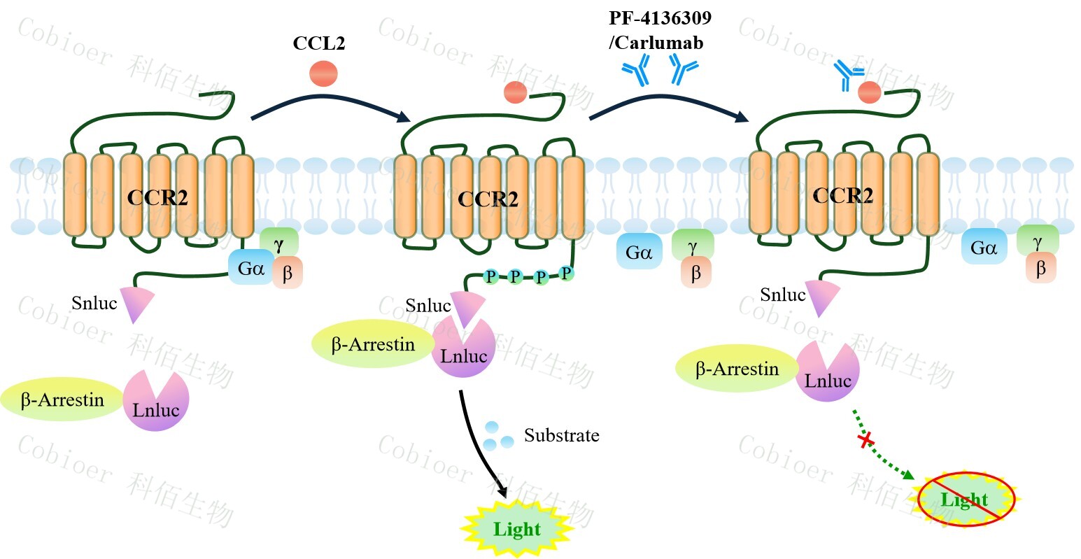 CCR2 β-Arrestin CHO 報告基因藥靶模型很好的模擬了體內 CCR2/β-Arrestin 的信號轉 導過(guò)程,原理見(jiàn)下圖所示。當缺乏配體刺激時(shí),β-Arrestin 不與 CCR2 結合,融合β-Arrestin 的熒光素酶處于失活構象,當 CCR2 遭遇配體刺激時(shí),融合熒光素酶報告基因的β-Arrestin 被招募,使熒光素酶報告基因處于激活狀態(tài),加入其底物后發(fā)光信號增強。![]() Figure 1. CCR2 β-Arrestin CHO 細胞模型原理圖 |