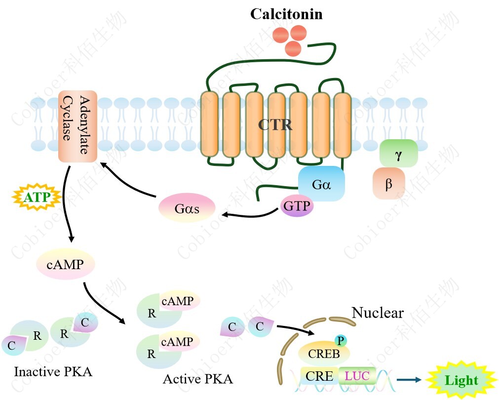 CTR(CALCR) CRE-Luc HEK293 報告基因藥靶模型很好的模擬了體內 CTR 的信號轉導過(guò)程,原理見(jiàn)下圖所示。![]() Figure 1. CTR(CALCR) CRE-Luc HEK293 細胞模型原理圖 |