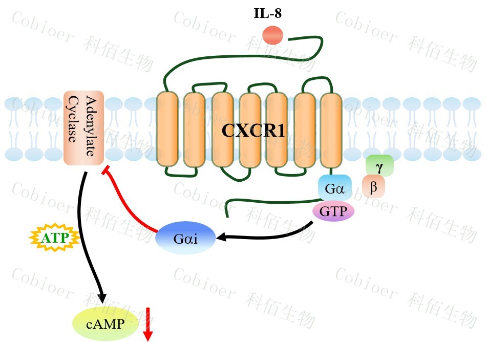 cAMP 在 G 蛋白偶聯(lián)受體(GPCR)信號轉導中是一種關(guān)鍵的第二信使。當配體結合 到 GPCR,構象發(fā)生變化,激活受體接著(zhù)激活 G 蛋白,Gi 的激活導致腺苷酸環(huán)化酶調控 cAMP 的下調。CXCR1 CHO 藥靶模型很好的模擬了體內 CXCR1 的信號轉導過(guò)程,原理見(jiàn)下圖所示。![]() Figure 1. CXCR1 CHO 細胞模型原理圖 |