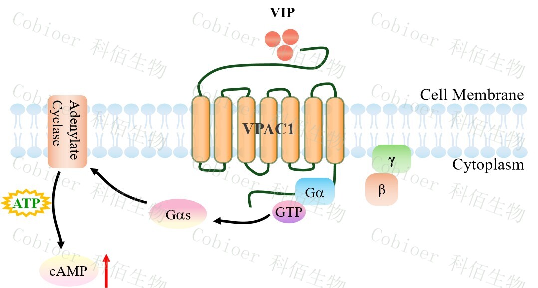 | PACAP/VIP 受體家族屬于 B 類(lèi) G 蛋白偶聯(lián)受體(GPCR),包含 PAC1R (PAC1)、 VPAC1R (VPAC1) 和 VPAC2R (VPAC2) 三個(gè)亞型,共同響應神經(jīng)肽 PACAP(垂體腺苷酸 環(huán)化酶激活肽)和 VIP(血管活性腸肽)的調控,通過(guò)激活 Gs/cAMP-PKA 核心信號軸 (部分亞型偶聯(lián) Gq/PLC)廣泛協(xié)調神經(jīng)內分泌、代謝穩態(tài)與免疫調節。 VPAC1 受體(血管活性腸肽受體 1 型) 作為 B 類(lèi) GPCR 家族的核心成員,主要在免 疫細胞、胃腸道及呼吸道高表達,以?xún)仍葱耘潴w血管活性腸肽(VIP) 和垂體腺苷酸環(huán)化 酶激活肽(PACAP) 為高親和力激活源,通過(guò)專(zhuān)一性偶聯(lián) Gs/cAMP-PKA 信號軸發(fā)揮關(guān)鍵 生理調控作用。VPAC1 的激活可抑制巨噬細胞炎癥因子釋放(如 TNF-α、IL-12)、促進(jìn)腸 道平滑肌舒張與上皮屏障修復、擴張支氣管并抑制黏液分泌,從而維持免疫耐受、胃腸動(dòng) 力及呼吸穩態(tài)。VPAC1 功能缺陷已被證實(shí)與炎癥性腸?。↖BD)、哮喘和類(lèi)風(fēng)濕關(guān)節炎的 病理進(jìn)程密切相關(guān),而靶向激動(dòng)劑在急性呼吸窘迫綜合征(ARDS)與 IBD 治療中已展現 顯著(zhù)療效,凸顯其作為免疫-黏膜穩態(tài)核心調節器的治療價(jià)值。 |