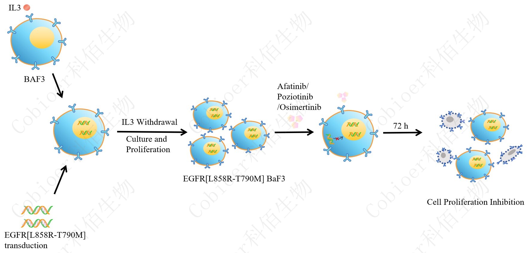 BaF3(小鼠原 B 細胞)的生長(cháng)和增殖需要 IL-3 的維持。通過(guò)引入各種表達激酶的基因, 能作為 BaF3 的驅動(dòng)基因,讓 BaF3 不再依賴(lài) IL-3 而增殖,進(jìn)而激酶基因成為 BaF3 增殖依 賴(lài)的驅動(dòng)基因,用于評估小分子藥物對激酶的靶向抑制作用,原理及流程見(jiàn)下圖所示。