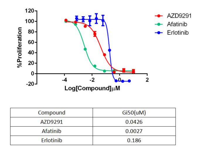 Figure 2. Anti-proliferation assay of three reference compounds on the EGFR WT (EGF Dependent)/BaF3 Stable Cell Line.