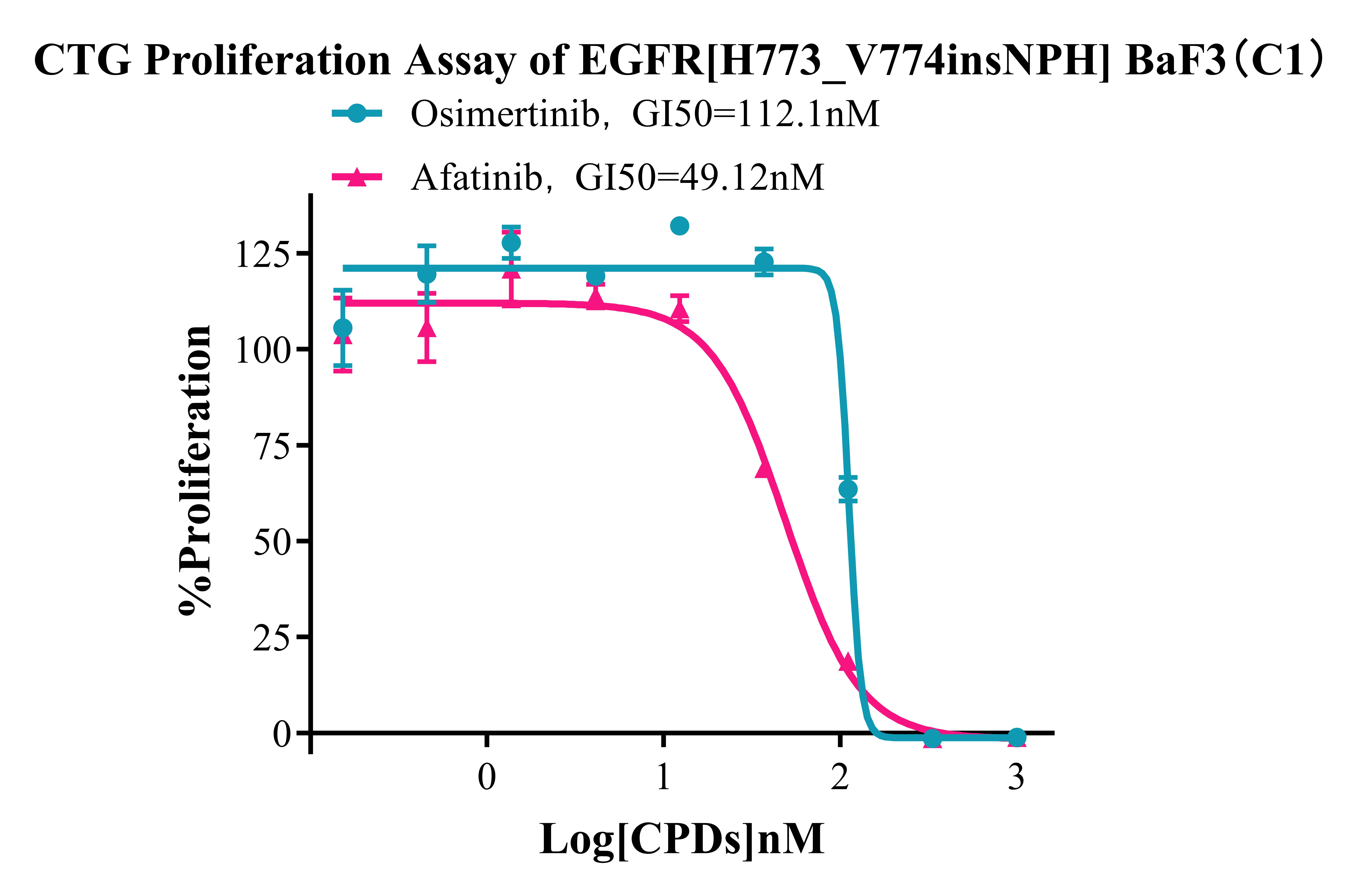 BaF3(小鼠原 B 細胞)的生長(cháng)和增殖需要 IL-3 的維持。通過(guò)引入各種表達激酶的基因, 能作為 BaF3 的驅動(dòng)基因,讓 BaF3 不再依賴(lài) IL-3 而增殖,進(jìn)而激酶基因成為 BaF3 增殖依 賴(lài)的驅動(dòng)基因,用于評估小分子藥物對激酶的靶向抑制作用,原理及流程見(jiàn)下圖所示。![]() Figure 1. EGFR[H773_V774insNPH] BaF3 細胞的構建原理圖 |