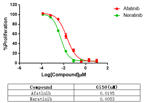 Figure 2. Anti-proliferation assay of two reference compounds on the Her2 A775_G776insYVMA/BaF3 Stable Cell Line |